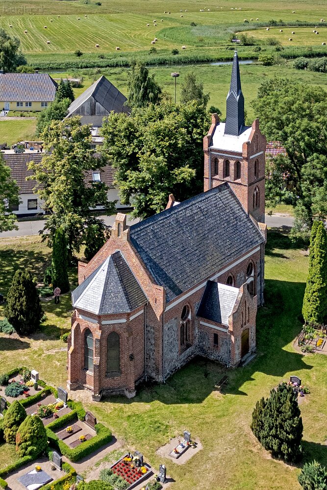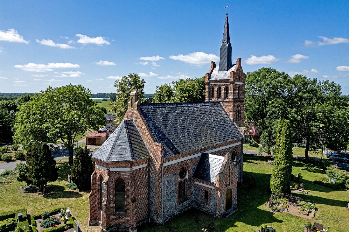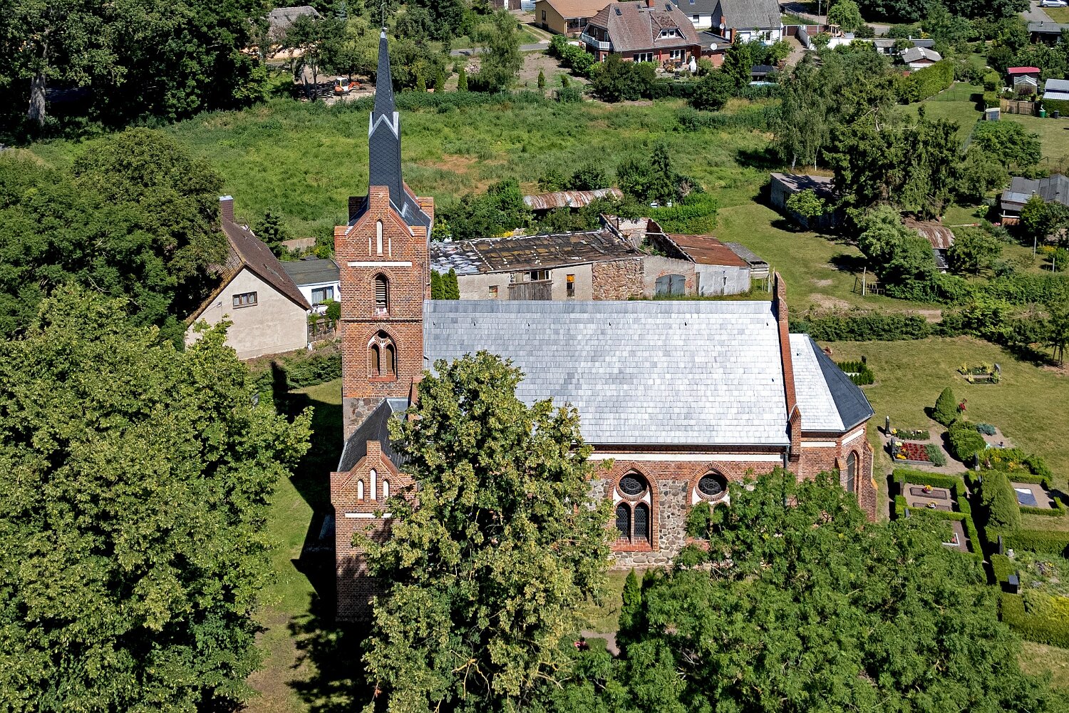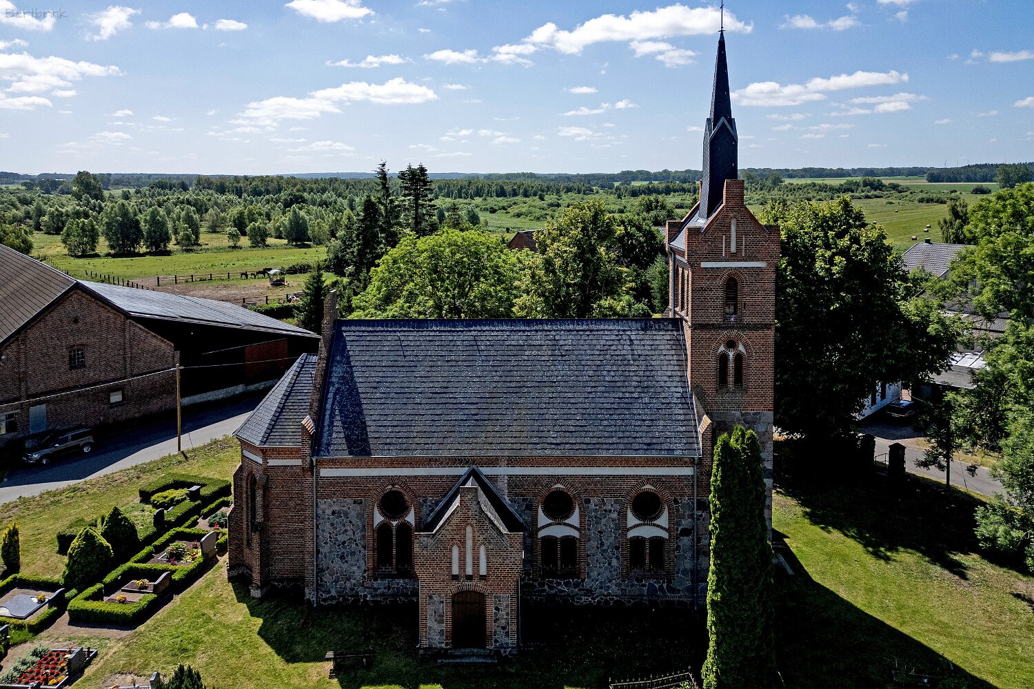 Die Feldsteinkirche Siedenbrünzow auf Drohnenfotos.