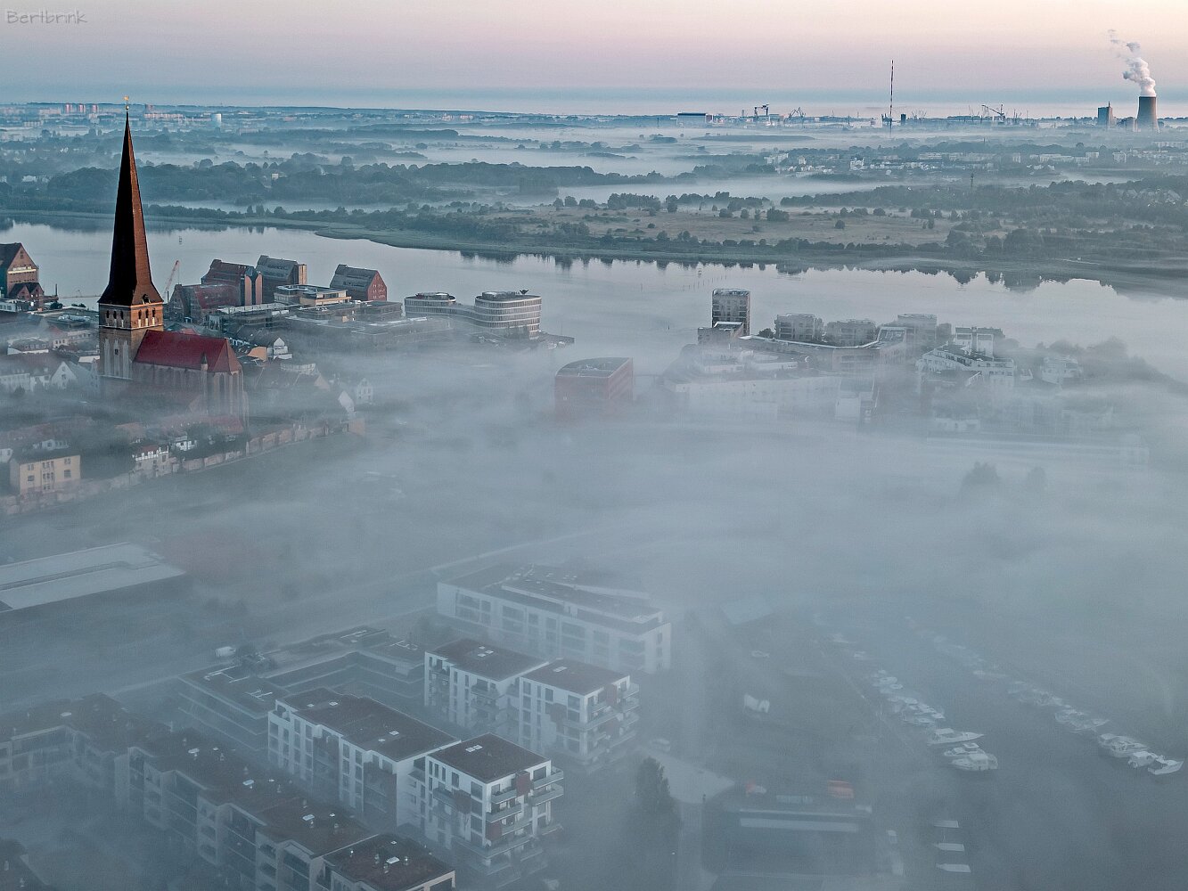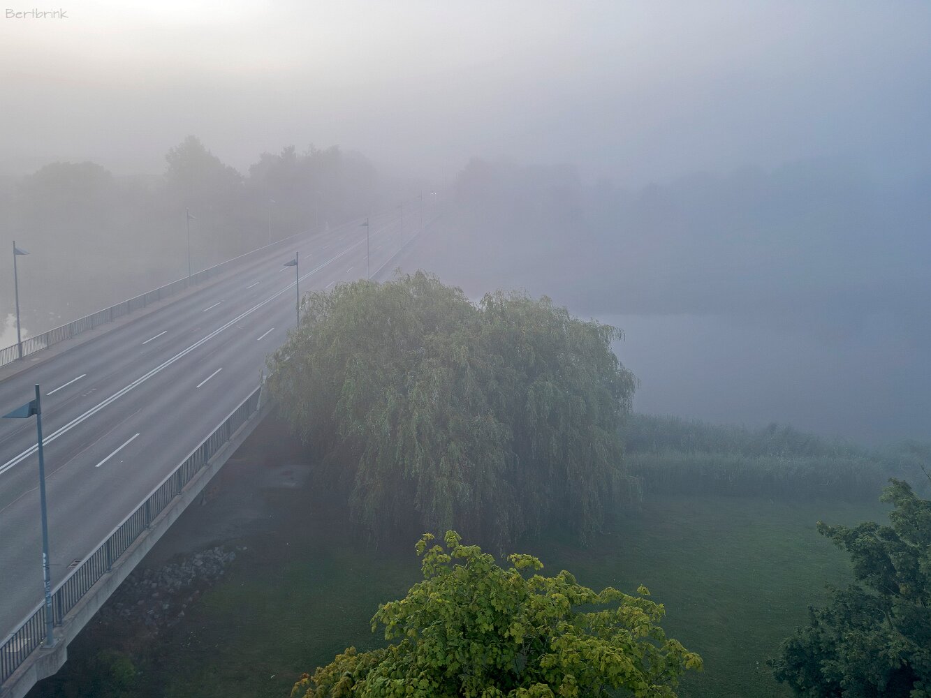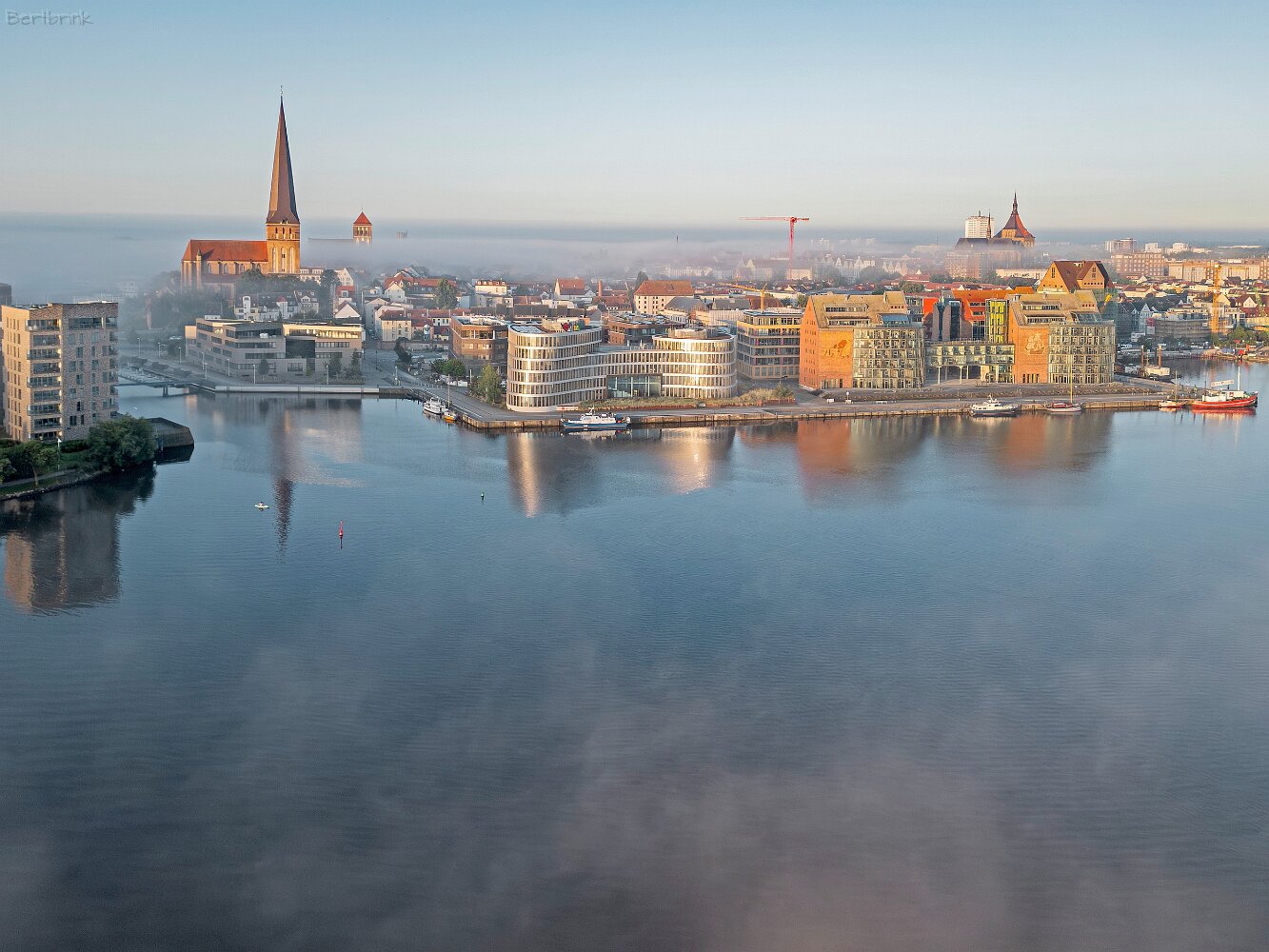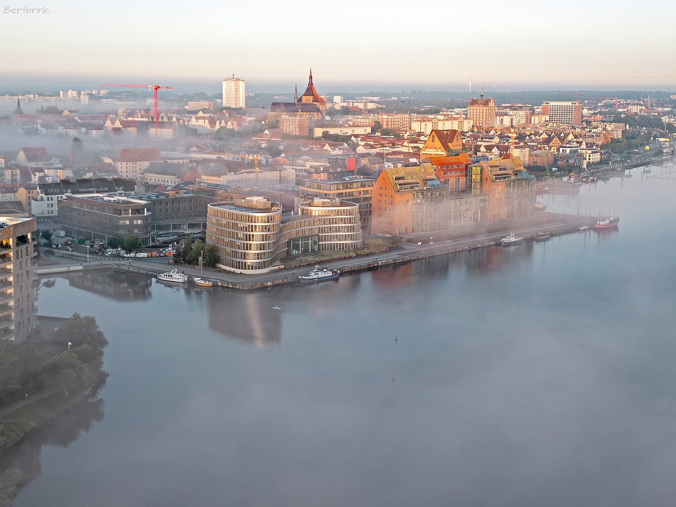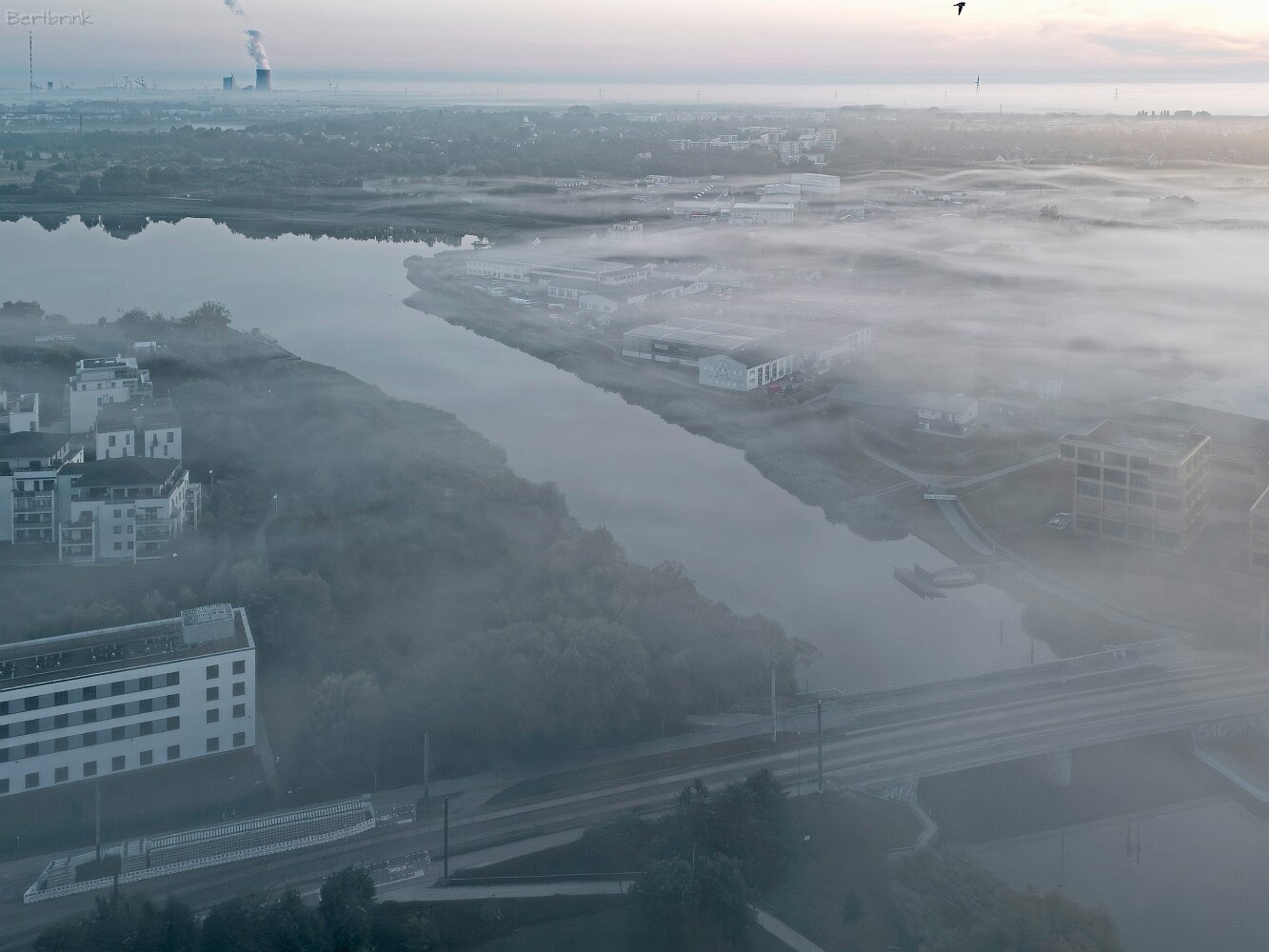 Sonnenaufgang im Nebel über der Warnow in Rostock