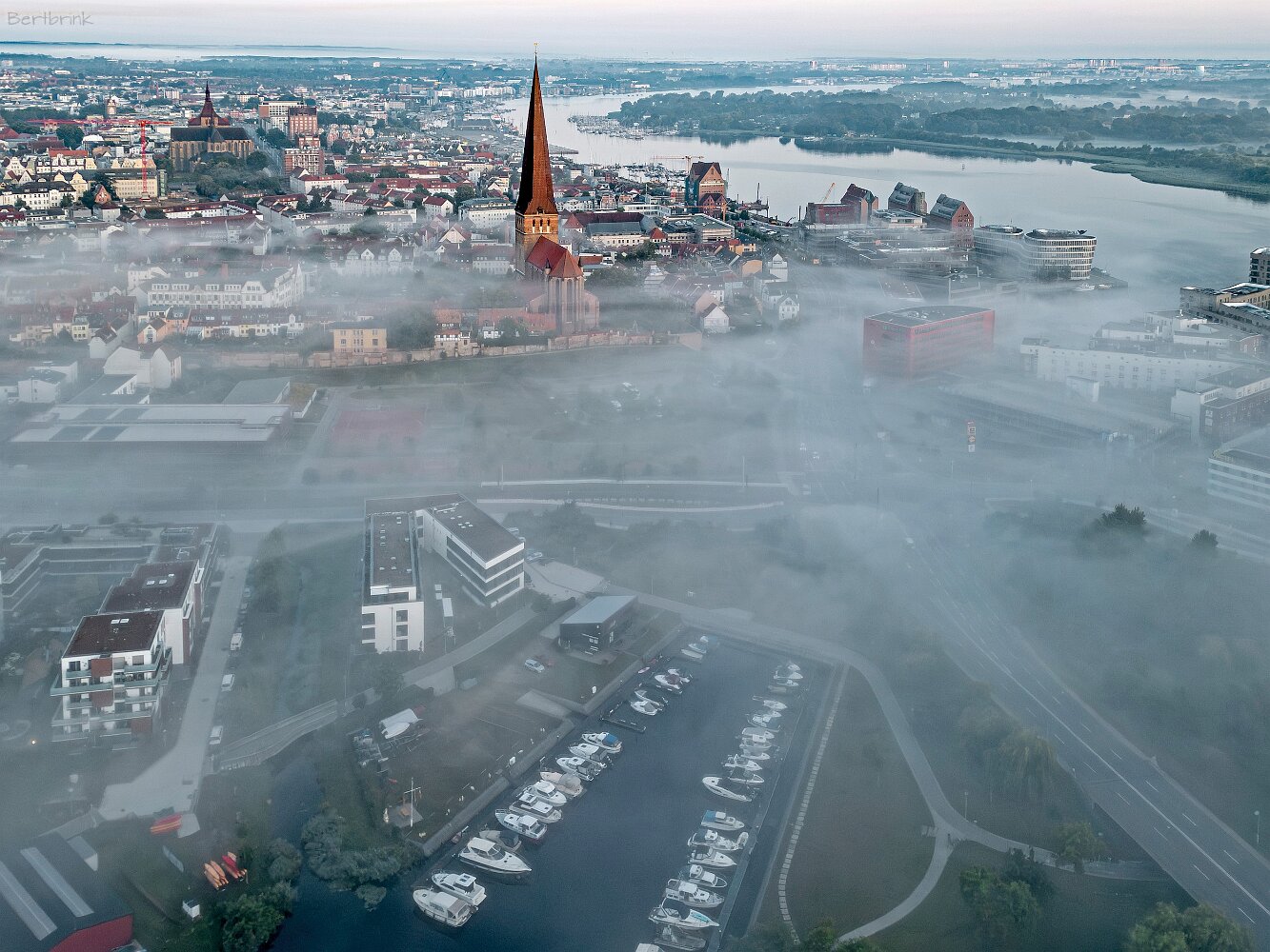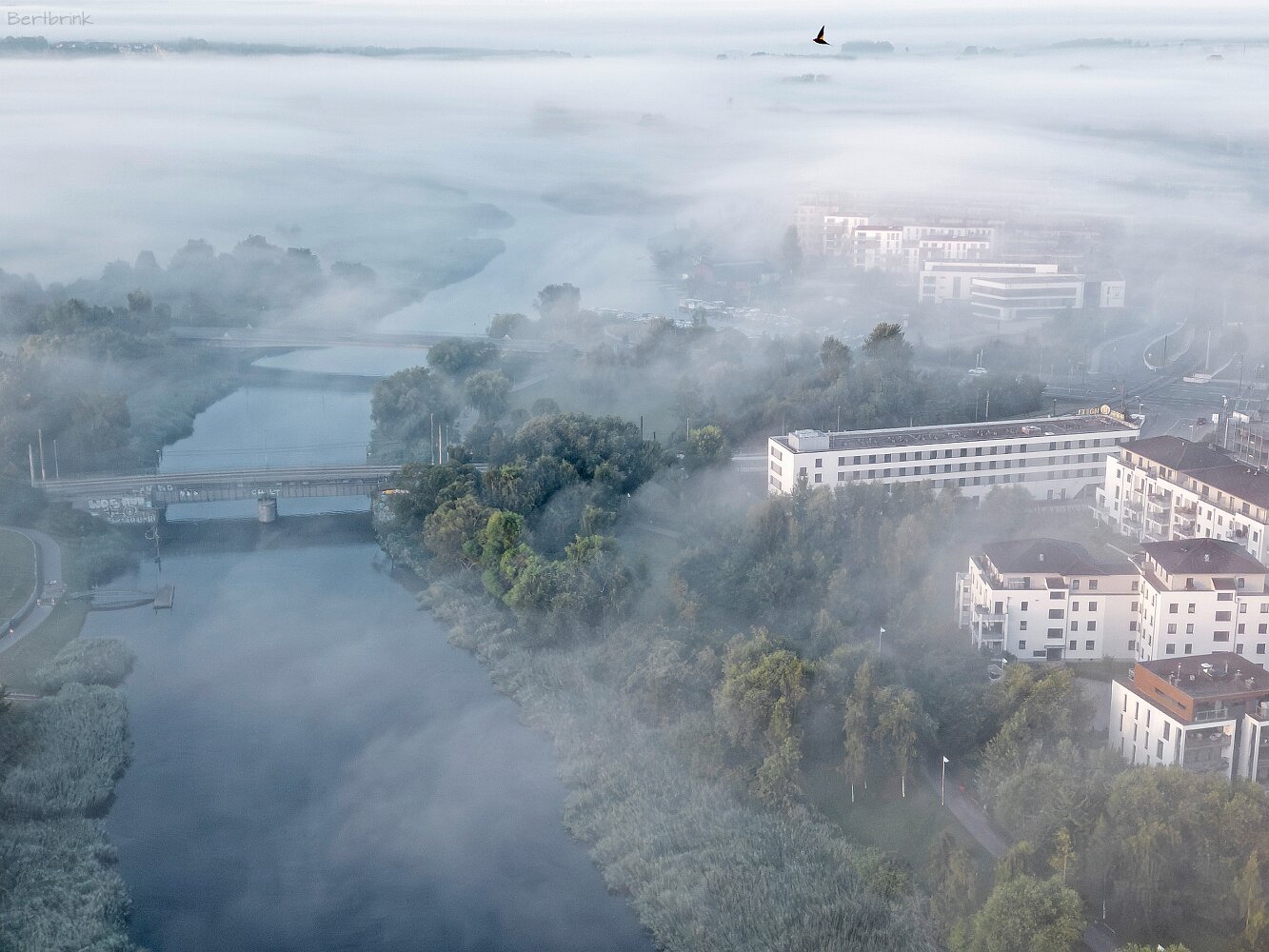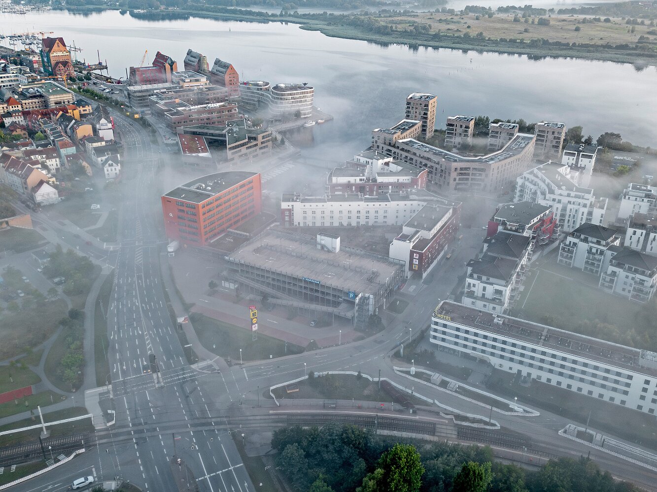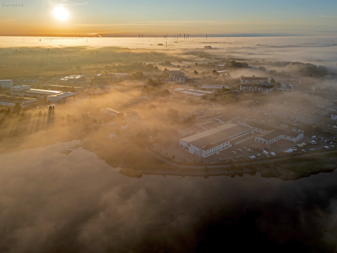 Sonnenaufgang im Nebel über der Warnow in Rostock