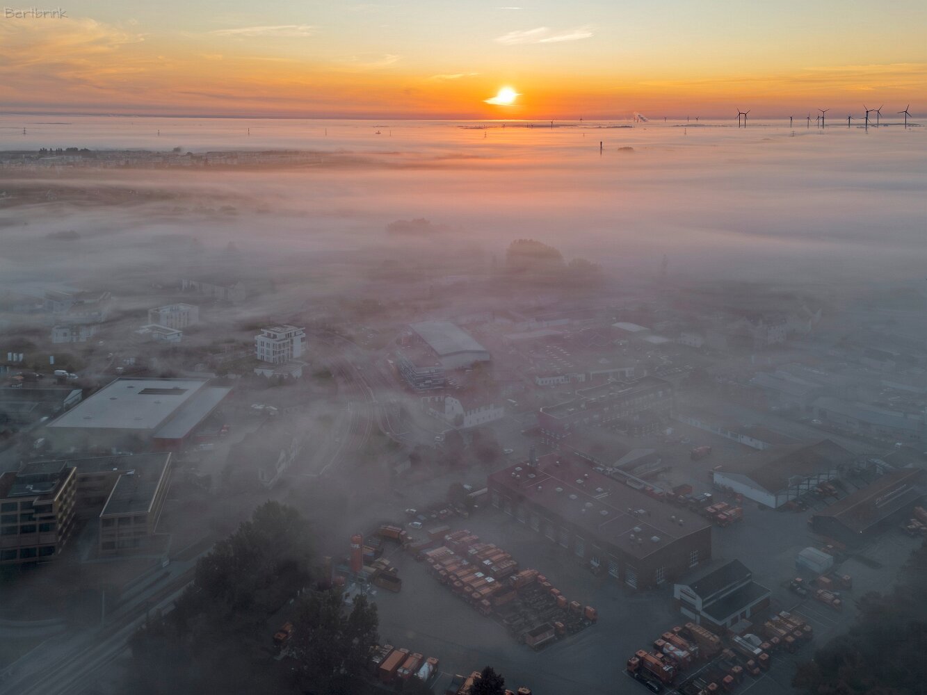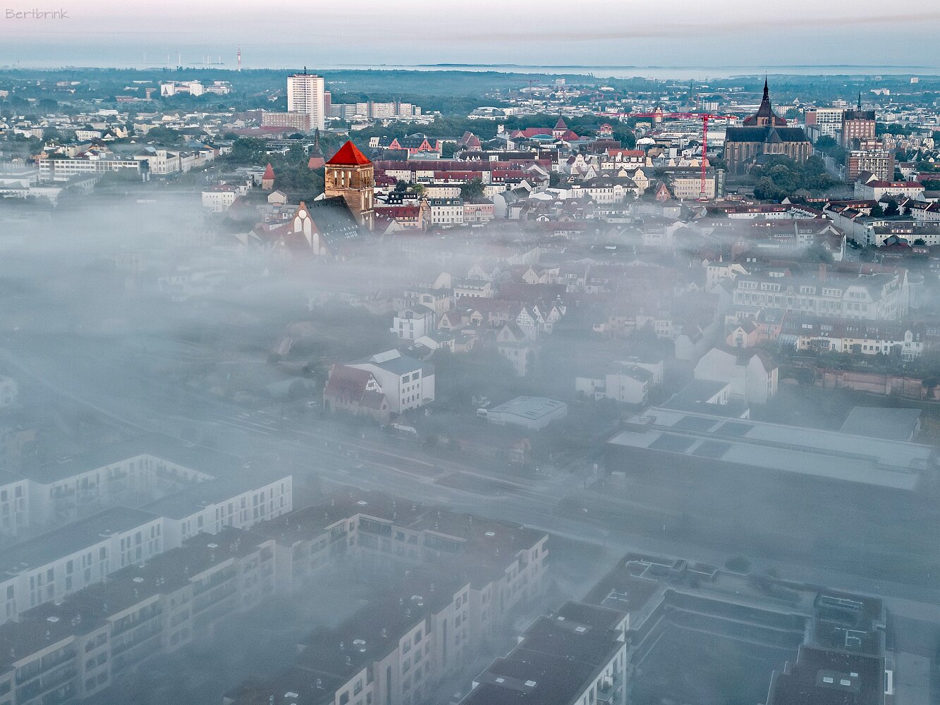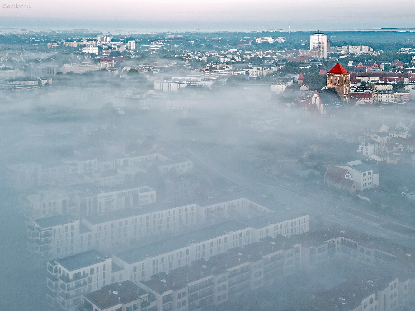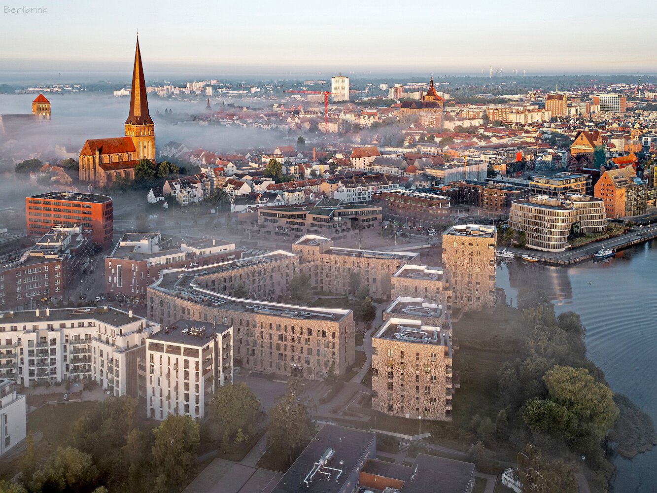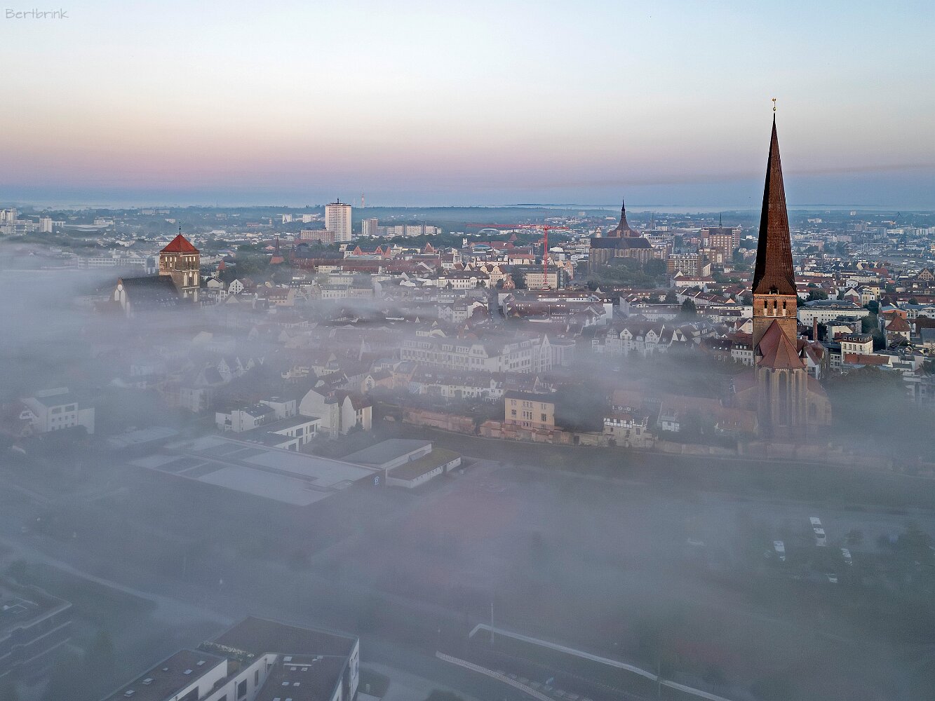 Sonnenaufgang im Nebel über der Warnow in Rostock