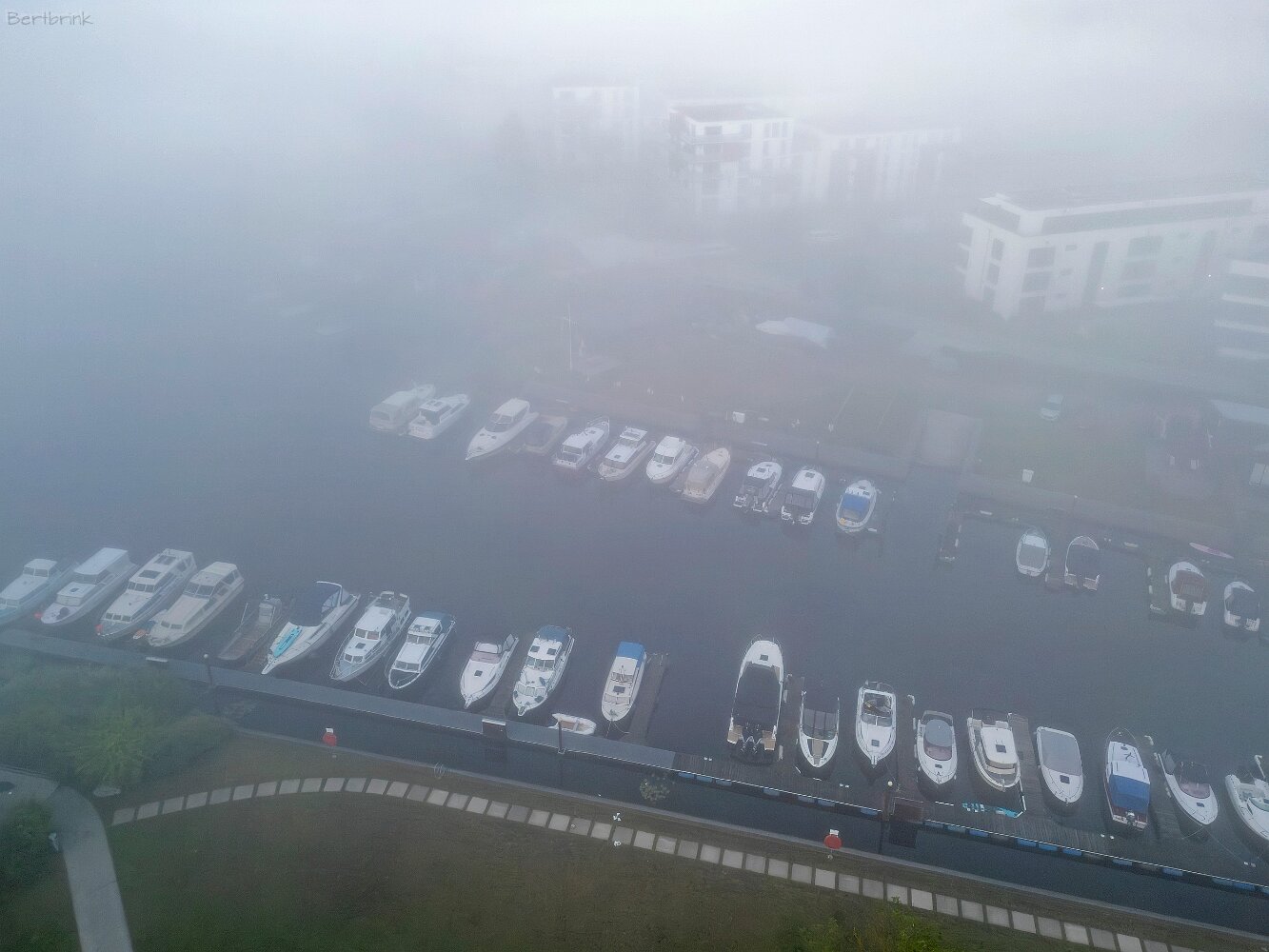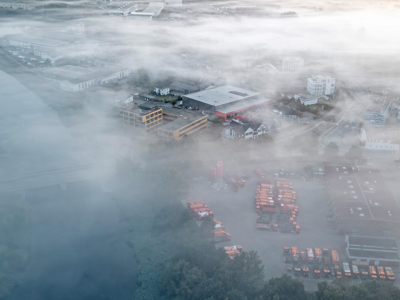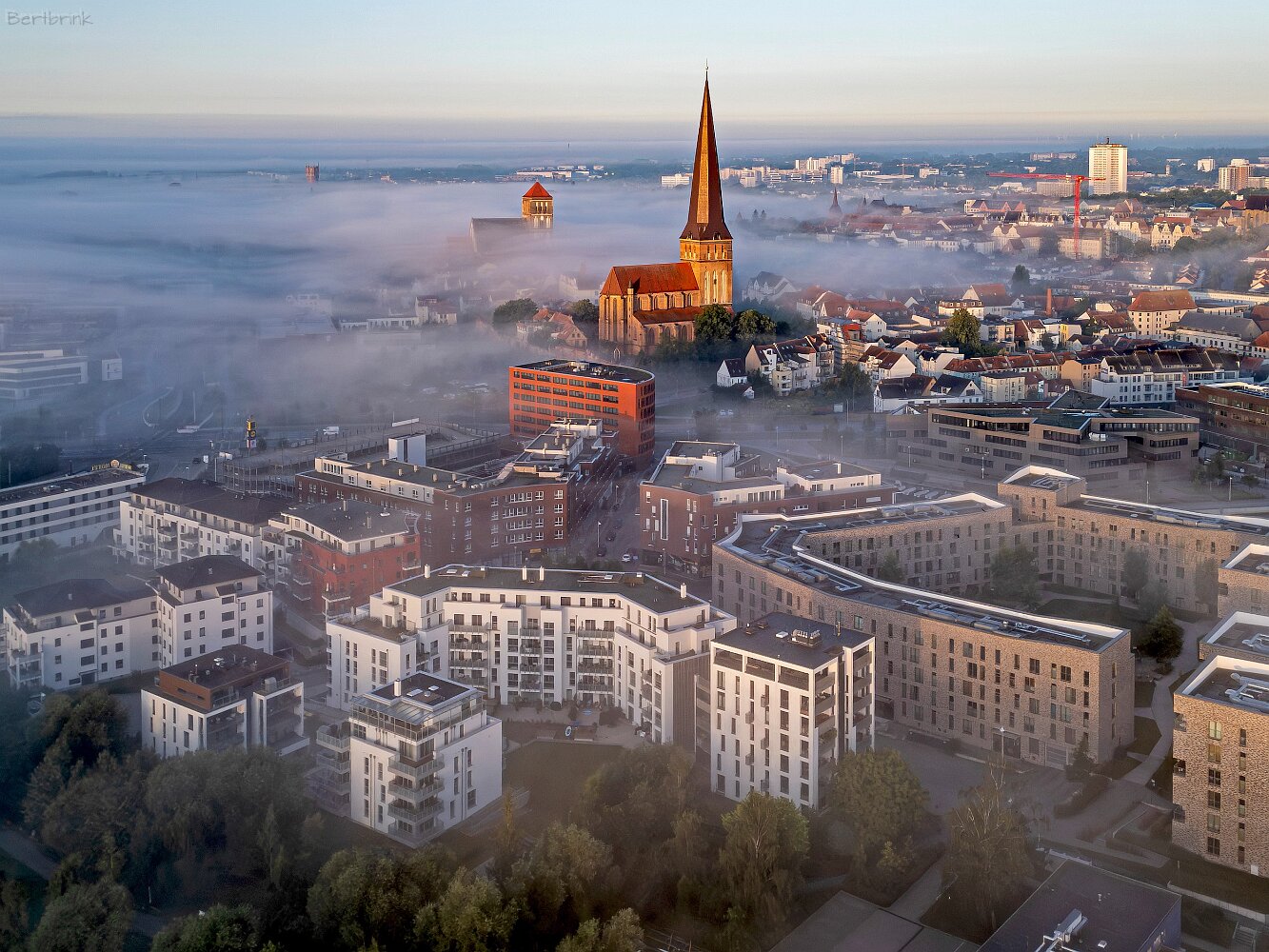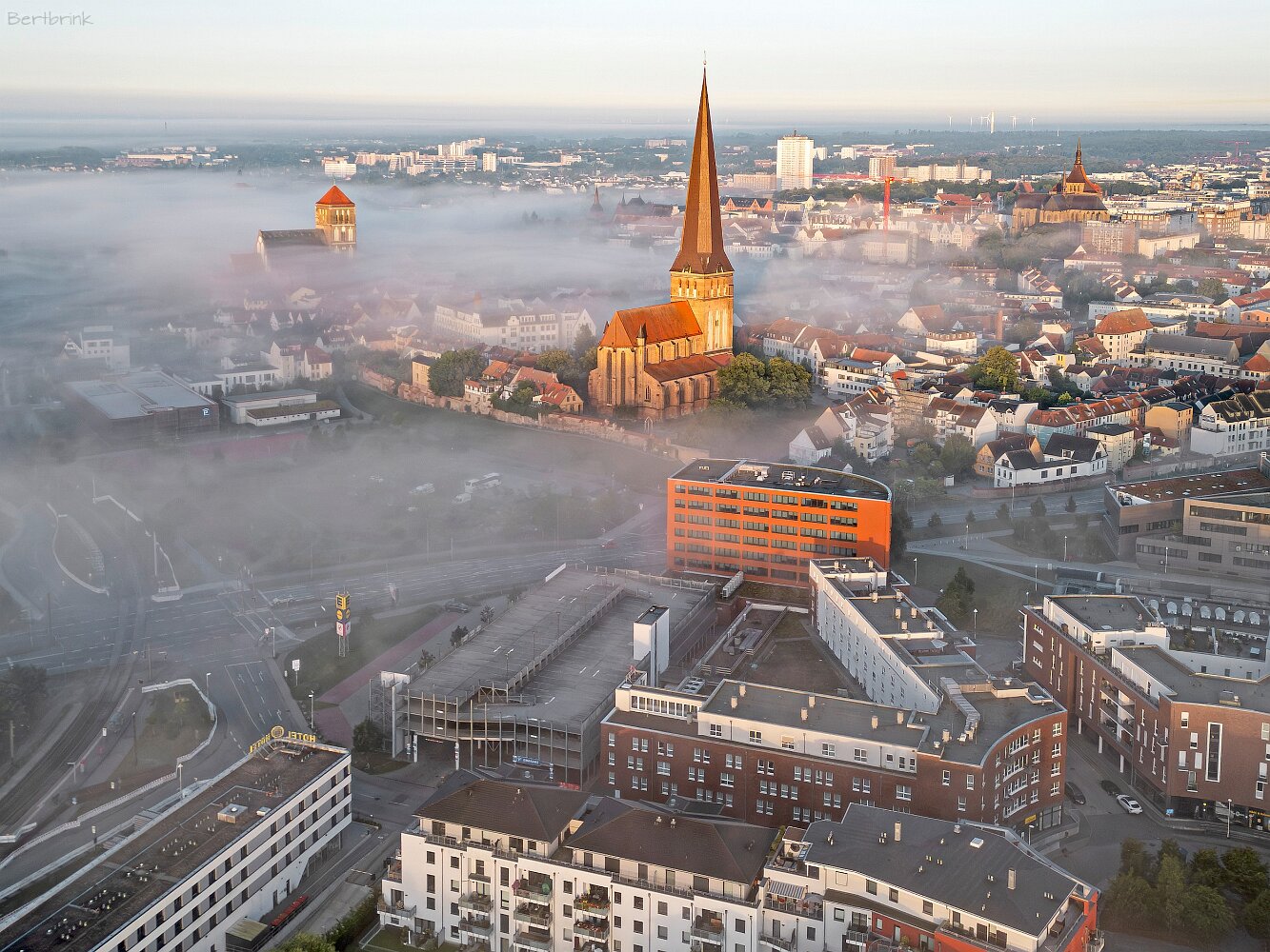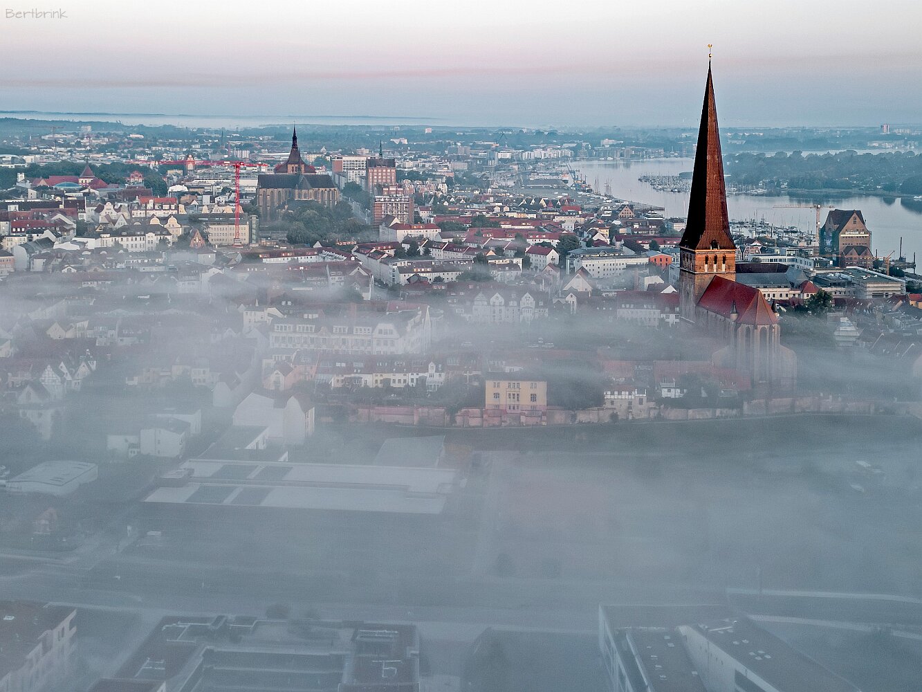 Sonnenaufgang im Nebel über der Warnow in Rostock