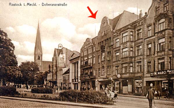 Das Wohnhaus Doberaner Straße 7, im Jahre 1903 gebaut, ist mit seinem zweigeschossigen Erker vom Jugendstil geprägt. Über dem darüber gelegenen Balkon ist ein Hahn auszumachen, der auf den Kaufmann Ferdinand Hahn mit seiner Spezial-Wollgarnhandlung im Hause hinweist. Mit ihm und seiner Familie ist das Haus über die Jahrzehnte verbunden. Seine Witwe Elisabeth ist auch noch im Adressbuch von 1949/50 zu finden und führte das Geschäft noch viele Jahre lang weiter.