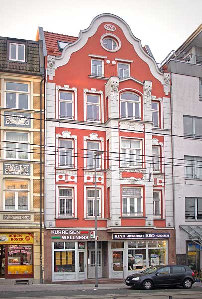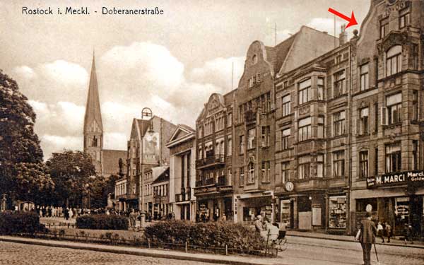 Das Haus Doberaner Straße 9, ein Kind des Jugendstils, war 1905 fertiggestellt. Wie schon die Nummer 2 ziert ein über drei Etagen reichender Erker die Fassade ohne allerdings in einem Balkon zu enden. Erhalten blieb auch der schöne Giebel.