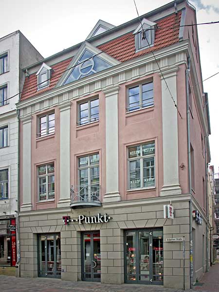 Das unter der Nummer 9 geführte Haus an der Ecke zur Kistenmacherstraße erlebte den Umbau um 1850 in der Zeit des Klassizismus. Zur Unterstreichung des baulichen Umbruchs soll angesichts seiner schlüssigen Charakterisierung ein Zitat aus dem 1927 bei Carl Hinstorff erschienenen Buch "Die bürgerlichen Bauten in Rostock und Güstrow in der Zeit von 1750 -1850" von Rudolf Parow-Souchon widergegeben werden: "Die hohen Giebel mussten flachen, klassizistischen Tempelgiebeln weichen. Da diese oft von Pilastern getragen werden, bekommen die Häuser etwas festes, straffes, was ganz dazu angetan ist, ihnen etwas stattliches zu geben, das sich zum palastartigen steigert." Dabei wurde das Dach des Hauses noch besonders betont. Die Seitenfront war eher schlicht und wurde um 1927 aufgewertet. Wirtschaftsgeschichtlich ist das Haus bis weit in unsere Zeit mit dem Hof-Juwelier Kerfack verbunden. Das Adressbuch von 1922 vermerkt darüber hinaus noch einen von Ottilie Küchenmeister und Else Wasmund geführten Blumenladen. Zwanzig Jahre zuvor lebte der Kaufmann Paul Küchenmeister im Hause. Später wurde das Familienunternehmen von den Juwelieren Hermann Peters und Alfred Sinner geführt. Das Haus gehörte da schon dem Gutspächter Willi Engelbrecht aus Woldegk. |