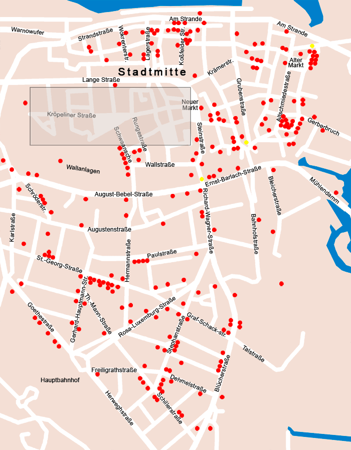 Karte Ausschnitt Stadtmitte Adolf-Wilbrandt-Str. 7 (Wohnhaus) Altbettelmönchstraße 3 (Michaeliskirche) Altbettelmönchstraße 4, (ehemaliges Fraterhaus der Brüder vom gemeinsamen Leben, Wollmagazin, Universitätsbibliothek) Alter Markt 22 (ehemaliges Küsterwohnhaus) Altschmiedestraße 32 (Wohnhaus mit Kemlade) Altschmiedestraße 33 (Wohnhaus) Altschmiedestraße 34 (Wohnhaus) Altschmiedestraße 35 / Bei der Nikolaikirche 1 a (Wohnhaus) Am Schwibbogen 6 (Wohnhaus mit Garten) Am Schwibbogen 7 (Hofflügel eines ehemaligen Speichers) Am Strande 2 b (ehem. Güterschuppen einschließlich Gleisanlage) Am Wendländer Schilde 7 (Wohn- und Geschäftshaus) Amberg 13 (Wohn- und Geschäftshaus) Amberg 14 (Wohnhaus) An der Hege 11 (Wohn- und Geschäftshaus) Auf der Huder 1a / 1b (ehemaliger Speicher) August-Bebel-Straße 1 (ehemalige Sozietät, Schifffahrtsmuseum) August-Bebel-Straße 5 (Wohnhaus) August-Bebel-Straße 9 (Wohnhaus) August-Bebel-Straße 15-20 (ehemaliges Staatssicherheitsgebäude, Haus der Justiz als Gesamtkomplex einschließlich Wachturm und Mauer) August-Bebel-Straße 32 (Wohnhaus mit Holzpflasterung in der Durchfahrt) August-Bebel-Straße 55 (ehemalige Villa des Kaufmanns Zeeck mit Garten und Einfriedung) August-Bebel-Straße 57 (Wohnhaus) Augustenstraße 16 (Wohn-und Geschäftshaus Paul-Friedrich-Scheel-Haus) Augustenstraße 44 (Tankstelle und Garagenkomplex) Augustenstraße 90 (Wohnhaus mit Holzpflasterung in der Durchfahrt) Badstüberstraße 5-6 (ehemaliger Speicher) Bahnhofstr. 11d (Lager- und Versandhallen des ehemaligen Güterbahnhofs) Beginenberg 1 (ehemaliges Handels- und Lagerhaus) Beginenberg 2 (historische Kelleranlage) Beginenberg 10 (Kindergarten mit Grünanlage) Beginenberg 25-26 (Vorderhaus des früheren Tattersall) Bei der Nikolaikirche 1 (St. Nikolaikirche) Bei der Nikolaikirche 3 (Wohnhaus) Bei der Nikolaikirche 4 (Wohnhaus) Bei der Nikolaikirche 5 (Wohnhaus) Bei der Nikolaikirche 6 (Wohnhaus) Bei der Nikolaikirche 7 (ehemaliges Pastorenwohnhaus mit Garten) Bei der Nikolaikirche 8 (Pastorenwohnhaus mit Garten) Bei der Petrikirche (St. petrikirche) Bei der Petrikirche (Slüterdenkmal) Bei der Petrikirche 3 (Wohnhaus) Bei der Petrikirche 4 (Wohnhaus) Bei der Petrikirche 5 (Wohnhaus) Bei der Petrikirche 6 (Wohnhaus) Bei der Petrikirche 7 (Wohnhaus) Bei der Petrikirche 8 (Wohnhaus) Bei der Petrikirche 10 (ehemaliges Pastorenwohnhaus) Beim Hornschen Hof 6 (ehemaliger dreiflügeliger Kaufmannshof) Beim St. Katharinenstift 5 (Wohnhaus) Beim St. Katharinenstift 8 (ehemaliges Franziskanerkloster, Hochschule für Musik und Theater) Beim St. Katharinenstift 9 (ehemaliger Speicher) Bleicherstraße (Lokschuppen des Friedrich-Franz-Bahnhofes) Bleicherstraße 1 (Teil des früheren Elektrizitätswerkes) Blücherstraße (Wasserturm) Blücherstraße 22 (Wohnhaus) Blücherstraße 34 (Wohnhaus), Blücherstraße 35 (Wohnhaus) Blücherstraße 34 (Wohnhaus), Blücherstraße 35 (Wohnhaus) Blücherstraße 61 (Wohnhaus mit Einfriedung) Blücherstraße 62 (Wohnhaus mit Einfriedung) Blücherstraße 63 (Wohnhaus mit Einfriedung) Blücherstraße 64 (Wohnhaus mit Einfriedung) Blücherstraße 68 (Wohnhaus mit Einfriedung) Blücherstraße 70 (Wohnhaus) Blücherstraße 71 (Wohnhaus) Breite Straße 11 (Ladenausstattung des ehemaligen Spirituosen- und Tabakwarengeschäftes) Burgwall 12 (Wohnhaus) Burgwall 13 (Wohnhaus) Dehmelstraße 4 (Wohnhaus) Dehmelstraße 10 (Wohnhaus) Dehmelstraße 13 (Wohnhaus) Ernst-Barlach-Straße 1 (Geschäftshaus) Ernst-Barlach-Straße 2 (ehemaliges Wohnhaus) Ernst-Barlach-Straße 5 (Kuhtor) Freiligrathstraße 14 (ehemaliges Wohnhaus mit Garten und Einfriedung) Gärtnerstraße 17 (Wohn- und Geschäftshaus) Gerberbruch 3 (Wohnhaus) Gerberbruch 32 (ehemalige Gerberei) Gerhart-Hauptmann-Straße / Herderstraße (Litfasssäule) Gerhart-Hauptmann-Str. 4 (Wohnhaus) Gerhart-Hauptmann-Str. 11 (Wohnhaus) Gerhart-Hauptmann-Str. 18 (Wohnhaus mit Einfriedung) Gerhart-Hauptmann-Str. 24 (Wohnhaus) Gerhart-Hauptmann-Str. 28 (Bahnhofsapotheke) Goetheplatz (Trafohäuschen) Goetheplatz 5-6 (Goethegymnasium) Goethestraße 15 (Wohnhaus) Goethestraße 16 (Wohnhaus) Goethestraße 18 (Wohnhaus) Goethestraße 21 (Wohnhaus) Goethestraße 22 (Wohnhaus) Graf-Schack-Straße 18 (Wohnhaus) Große Wasserstraße 1 (Wohn- und Geschäftshaus) Große Wasserstraße 2 (Wohn- und Geschäftshaus) Große Wasserstraße 19 (Wohn- und Geschäftshaus) Große Wasserstraße 22 (Wohn- und Geschäftshaus) Große Wasserstraße 30/ Grubenstraße 1 (Wohn- und Geschäftshaus mit Altenteiler und der ehemaligen Likörfabrik Krahnstöver) Grubenstraße 32 (ehemaliger Speicher) Hartestraße 8 (Wohnhaus) Hartestraße 9 (Wohnhaus) Hartestraße 26 (Wohnhaus) Hartestraße 27 (ehemaliges Kaufmannshaus mit Speicher) Hermannstraße 14 (Wohnhaus) Hermannstraße 19 (Wohnhaus) Hermannstraße 24 (Wohnhaus) Hermannstraße 32-34 (Wohnhausgruppe) Hermannstraße 36 (ehemaliges Wohnhaus) Hinter dem Rathaus 2 (ehemaliges Walldienerhaus) Hinter dem Rathaus 4 (Stadthaus) Hinter dem Rathaus 5 (Kerkhofhaus, Standesamt, Archiv, Magazinbau) Hinter der Mauer 1 (Lagebuschturm Mauerturm) Karlstraße 4 (Wohnhaus) Kleine Wasserstraße 25 (Wohnhaus) Kleine Wasserstraße 26 (Wohnhaus) Koch-Gotha-Straße 6 (Wohnhaus mit ehemaligem Pferdestall und Wagenremise) Koßfelderstraße 11 (Geschäftshaus) Koßfelderstraße 11 (Geschäftshaus) Koßfelderstraße 20 (Wohn- und Geschäftshaus) Lagerstraße 7 (Geschäftshaus) Lagerstraße 8 (Wohnhaus) Lagerstraße 17 (ehemaliges St.-Georg-Hospital) Lagerstraße 26 u. Speicher Strandstraße (Geschäftshaus) Lagerstraße 32 (Wohnhaus) Lohgerberstraße 1 (Wohnhaus) Lohgerberstraße 11 (Fassade des Speichers) Lohgerberstraße 28 (Fassade des Wohnhauses und historische Kellerwände) Lohgerberstraße 29 (Fassade des Wohnhauses und historische Kellerwände) Lohgerberstraße 32 (Wohnhaus mit Kellerwohnung) Lohgerberstraße 35 (Wohnhaus) Strandstraße 97 (Mönchentor) Mühlendamm 8 (ehemaliges Mühlengebäude) Mühlenstraße 1, St