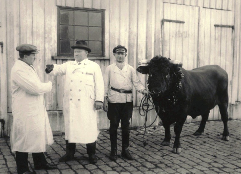Zu den Rostocker Fleischern, die auf dem Schlachthof einkauften, gehörte auch Paul Seibt, der sein Geschäft im Barnstorfer Weg 51 hatte. Er ist der Großvater von Andreas Stach, der die Fleischerei heute am selben Standort führt. Ein Foto aus den 1930er Jahren zeigt den Opa in eindrucksvoller Positur auf dem Schlachthof. Die Fleischerei wurde 1890 von Fritz und Henriette Seibt eröffnet. Damals musste das Fleisch noch mit der Karre ins Geschäft gebracht werden. Das war auch in den 1920er Jahren noch so, als Großvater Paul die Führung der Firma übernahm. 1962 konnte Andreas Stachs Mutter Gisela aus der Familie Seibt nach erfolgreich bestandener Meisterprüfung die Fleischerei übernehmen. Heute ist die Fleischerei Seibt in vierter Generation das älteste Unternehmen der Branche in Rostock. Die fünfte Generation steht schon in den Startlöchern.