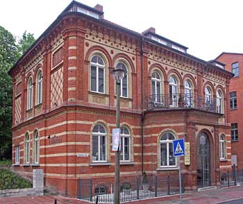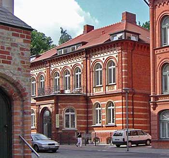 Es sei ein Beispiel für die angestrebte Hebung des Ziegeleigewerbes im Lande, auch in künstlerischer Hinsicht, schrieb der einstige, 2004 verstorbene Stadtdenkmalpfleger Hans-Otto Möller in der von ihm bearbeiteten, 1984 erschienenen Denkmalliste der Stadt Rostock über das alte Sparkassen- gebäude in der Schwaanschen Straße 1. Übertrieben war das keineswegs, denn der von Fritz Saniter nach lombardischem Vorbild im Stil der Neorenaissance errichtete Klinkerbau ist geradezu ein Paradebeispiel das genannte Gewerbe. Nach langem Leerstand und sorgfältiger Restaurierung zeigt das als erste Rostocker Sparkasse errichtete Haus, für das 1880 der Grundstein gelegt wurde, mit welcher Kunstfertigkeit Architekten und Bauleute dabei zuwerke gingen. Welch vielfältige Gestaltungsmöglichkeit der Ziegelstein bietet, wird an diesem Bau regelrecht exemplarisch vorgeführt. Mit seinen zwei Geschossen und sieben Achsen unter einem flachen Walmdach macht es schon den Eindruck eines Palazzo, in dem es sich ein lombardischer Graf gut gehen ließ. Das mag der Betrachter der Fassade angesichts reicher Schmuckelemente aus gelbem und rotem Backstein, Pilaster mit Terrakotten, diverser Ornamente auch so sehen. Der Vorbau mit dem Portal vor den drei mittleren Achsen mag ein Übriges dazu beitragen. Doch spätestens die Sgraffitomalereien an der zum Wall hin gelegenen Südseite zeigen, worum es in dem bemerkenswerten Bau geht. Sind da doch die Engelein zum einen bienenfleißig und zum anderen sparsam zuwerke. Das aber ist Geschichte. Das Haus wird heute gewerblich genutzt. Der Eingang ist mit einer modernen Glastür versehen. Die ursprüngliche Tür existierte nicht mehr. Aus denkmalpflegerischer Sicht ist es unter anderem gelungen, eine gute Lösung für eine lichte Dachgeschoßgestaltung mittels kleiner Gauben zu finden.