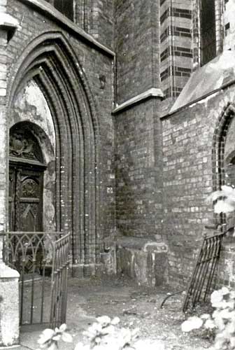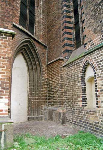 Das Nordostportal von St. Marien "Söben Doern to Sint Marien Kark", heißt es gleich in der ersten Zeile der berühmten Rostocker Kennewohrn. Das aber war vor Zeiten. Inzwischen verfügt die Rostocker Marienkirche nur noch über vier Portale, von den beiden kleinen Pforten an der nördlichen und südlichen Seite des Westwerks einmal abgesehen. Es ist anzunehmen, dass es in der wuchtigen Fassade des Turmbaus neben den beiden vorhandenen noch ein mittleres Portal gegeben hat. Das Mauerwerk deutet jedenfalls darauf hin. Die beiden anderen Portale führen in das südliche und nördliche Seitenschiff. Zwei weitere befanden sich jeweils östlich davon zu Beginn des Chorumgangs im Norden und Süden. Schon vor längerer Zeit aber wurde das Portal in der Südwand zugemauert. Die auf unseren Vergleichsfotos abgebildete Situation im Nordosten zeigt, dass das dortige mit dem Jahr 1730 datierte Barockportal 1989 noch an seinem Platz war. Zu sehen ist auch noch das davor gestellte Gitter. Es war allerdings in reichlich schlechtem Zustand. Inzwischen fand dieses Gitter seinen Platz vor dem einstigen Südostportal. Schmiedemeister Oldenburg aus Gressow bei Wismar hatte es sorgfältig erneuert und aufgebaut. 1995 wurde das Nordostportal zugemauert. Besonders glücklich ist mit dieser Entscheidung niemand. Doch die Umstände machten den Schritt erforderlich. Zum einen war das Portal ob seiner bescheidenen Stabilität ein steter Unsicherheitsfaktor. Zum anderen benutzte der eine oder andere Bürger die Ecke zur Entledigung seiner wässrigen Leibesprobleme. Das dadurch arg in Mittleidenschaft gezogene Holz hätte den "Stress" auf Dauer nicht durchgehalten. So fand die wertvolle Schnitzarbeit also im Inneren der Kirche einen neuen Standort, an dem sie sich, einmal "trockengelegt", gut erholt hat. Dort ist sie an der Innenseite des Portals zu sehen. Im Zusammenhang mit dem Schließen des Portals erneuerten die Mitarbeiter des Arbeitsförderungswerks (AfW) das Mauerwerk und sanierten auch die rechts daneben gelegene Mauernische. Diese Nische war für das Armen-Seelen-Licht des Friedhofs bestimmt, besaß aber schon zu Zeiten Schlies um 1900 keinen Schmuck mehr. Die noch vorhandene Stütze hielt einen Christus am Kreuz. Auf lange Sicht gesehen soll für das Portal eine andere Lösung gefunden werden. In absehbarer Zeit ist dieser Gedanke aber nicht umzusetzen. |