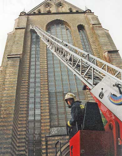 Rostocks größtes gotisches Bauwerk Schutzmaßnahmen am Südgiebelfenster Gelegentlich tritt die Feuerwehr auch mal in Aktion, wenn es nicht brennt oder Wassereinbrüche zu bekämpfen sind. Kürzlich rückte sie mit einer 37 Meter langen Leiter zur Marienkirche aus. Der Förderverein hatte um Hilfe gebeten, die von der Rostocker Berufsfeuerwehr ganz selbstverständlich gewährt wurde. Es galt, an den Fenstern des Südgiebels Schutzmaßnahmen vorzunehmen. Während Feuerwehrmann Heiko Hacker die Leiter bediente, stand sein Kollege und Ausbildungsleiter der Höhenrettung Winfried Stahnke in knapp 30 Metern Höhe im Korb. Mit Silikonspritze und Taubengitter versehen ging er ans Werk. Erstere diente zum Abdichten undichter Stellen an den Fenstern, letzteres wurde angebracht um den zahlreichen Tauben den Zutritt zu ihrem geliebten Domizil zu verwehren. Denn die Taube als Symbol des Friedens hin und her, ihre Hinterlassenschaften sind dem Gotteshaus nicht gerade zuträglich. Zerfrisst der Kot der lieben Tierchen doch auch denn uralten Backstein. Zum Schluss waren alle zufrieden, Klaus Niebuhr und Frank Sakowski vom Förderverein weil ein kleines aber wichtiges Stück Erhaltungsarbeit getan wurde und die Mannen von der Feuerwehr, weil sie wieder einmal zum Nutzen historischer Bauten Rostocks ausrücken konnten. |