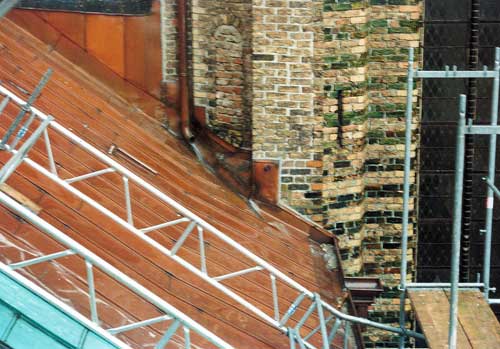 | Das neue Dach der von-Heinen-Kapelle. Aus dem Rohr fließt reichlich Wasser. Hier kann es keinen Schaden anrichten. |