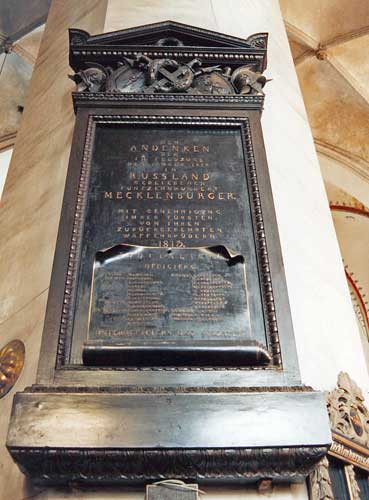 Rostocks größtes gotisches Bauwerk Die Gedächtnistafel von 1817 Im Jahre 1813, vor 190 Jahren, kehrten überlebende mecklenburgische Offiziere aus dem Rußland-Feldzug zurück und wandten sich mit der Bitte an Herzog Friedrich-Franz von Mecklenburg-Schwerin, ihrer gefallenen Kameraden in würdiger Form zu gedenken. Friedrich-Franz nahm sich der Sache an und bestimmte " den Pfeiler rechter Hand Meines Chores" in der Rostocker Marienkirche zum Standort einer Gedenktafel. Karl-Friedrich Schinkel lieferte einen Entwurf, dessen Umsetzung in der Berliner Eisengießerei an technischen Problemen scheiterte. Schließlich wurde die Tafel nach der Vorlage des Rostocker Bildhauers Behr unter Berücksichtigung der Schinkelschen Vorlage vom Metallfabrikanten Brand und von Tischler Schwedler fertiggestellt. Ein mit einem Dreieckgiebel und einem mit Waffen und Lorbeerkranz geschmückten Fries versehener bronzierter Eichenholzrahmen trägt eine Zinntafel mit dem Text: " Dem Andenken der im Feldzug des Jahres 1812 in Rußland gebliebenen Mecklenburger. Mit Genehmigung ihres Fürsten von ihren zurückgekehrten Waffenbrüdern. 1813." Auf der darunter angebrachten Totenliste stehen dreiundzwanzig Namen unter denen so bekannte wie Moltke und Pressentin zu finden sind. Am 23. November 1817 wurde die Tafel angebracht. Den Gedenkgottesdienst hielt Pastor Becker. In einem Bericht an den inzwischen zum Großherzog aufgestiegenen Friedrich-Franz fügte der Bevollmächtigte der zurückgekehrten Offiziere, Major von Kamptz, hinzu, dass die Vorsehung für immer die Feier ähnlicher Tage von Mecklenburg abwenden möge, eine Bitte, die unerfüllt blieb. Die Gedenktafel erinnert noch immer am selben Platz an einen der vielen unsinnigen Kriege auf dieser Welt. |