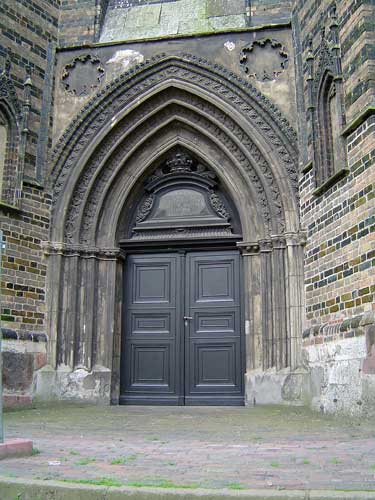| Das Portal im nördlichen Seitenschiff mit den reparierten barocken Türblättern. |