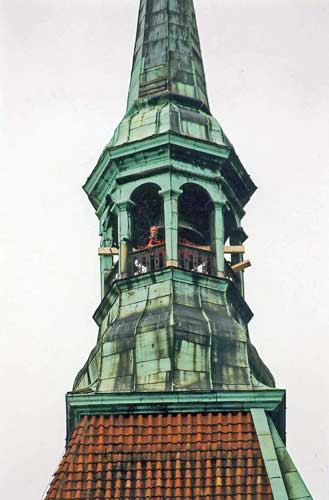 Ein Schaden an der Turmlaterne Am vergangenen Montag rückten Zimmerleute auf die Plattform des St.-Marien-Kirchtumrs vor und sicherten die in der Laterne hängende Stundenglocke. Deren Haltebolzen weisen teils starke Rostschäden auf und müssen erneuert werden. Sie sollen demnächst ausgewechselt werden. Die 3000 Kilogramm schwere Glocke ist die zweitälteste der Marienkirche. Sie wurde im Jahre 1379 gegossen. In seinem Werk "Die Kunst- und Geschichts-Denkmäler des Großherzogtums Mecklenburg-Schwerin" beschreibt der Kunsthistoriker Friedrich Schlie die Glocke und gibt eine in Minuskeln gehaltene Inschrift wieder. Sie enthält im vorderen Teil in gekürzter Schreibform die Jahreszahl "anno domini mccclxxix" und im hinteren Teil den auch auf anderen Glocken zu findenden Spruch "Oh, König der Ehre Jesu Christi, komme mit Friede". Schlie erläutert, dass "die Umschrift nicht vollständig auf der Glocke hat angebracht werden können, sondern zuletzt etwas ausgelassen ist". Und, da die Glocke ziemlich hoch in der offenen Turmgalerie hinge, hätte er sie mit einem Fernglas betrachtet. Er schreibt dazu: "Soviel mit Hülfe eines Krimstechers zu ermitteln war, steht hinter pace nur ein Blatt. Das lange Feld ist mit einem aus zwei Reifen bestehenden Bande verziert, über welchem abwechselnd eine blattartige und eine (von ihm skizzierte) Verzierung angebracht sind. Das Band selbst ist in gleichmäßigen Zwischenräumen mit kleinen Kreisen besetzt, in deren Mitte sich ein kleiner Knauf befindet. Unterhalb des in der Inschrift befindlichen Blattes ist in dem erwähnten Bande ein Vierpass mit einem Viereck im Inneren angebracht. Leider ist jedoch bei der Kleinheit des Zeichens und der Höhe, in welcher es sich für den Betrachter befindet, der Inhalt dieses Vierrecks nicht genau zu erkennen." Schlie berichtet weiterhin, dass in der Laterne seinerzeit eine weitere, eine Viertelstundenglocke, hing. Laut zitierter Inschrift wurde sie von Laurenz Strahlborn in Lübeck gegossen. Wo diese Glocke hing, ist ungewiss. Auch über ihren Verbleib ist nichts bekannt. Schlie beschreibt die Inschriften als nur teilweise zu lesen, " da beide Glocken hier dicht zusammenhängen". Die Plattform unter der Laterne ist für Besucher leider nicht zugänglich. |
