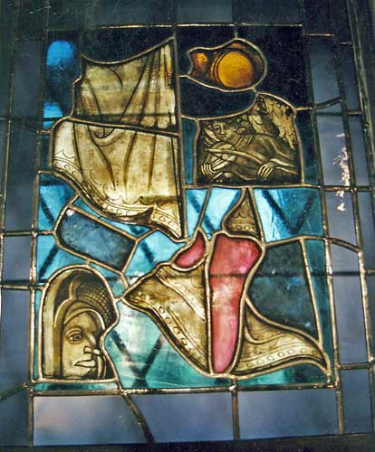 Scherben mit Engel In der als "Scherben mit Engel" bezeichneten Scheibe sind allerhand Details zu erkennen. Zum einen wird ein Engel dargestellt, der auf einer Fiedel spielt. Der Spieler ist in eine Tunika mit breitem Kragen gehüllt und scheint hingebungsvoll zu spielen. Der weite linke Ärmel deutet die streichende Bewegung an. Das Instrument und die Flügel des Engels sind ebenfalls gut zu erkennen. Was für eine Melodie mag er wohl spielen? Die darunter angeordneten Felder zeigen Fragmente verschiedener Gewänder, deren Faltenwürfe wiederum gut auszumachen sind. Abgegrenzt von dem dazugefügten grünen Gras ist ein recht strenges Gesicht zu erkennen. Ein starres Auge blickt scheinbar ins Leere. Die vorgeschobene Unterlippe verstärkt den ohnehin nicht gerade erquicklichen Ausdruck des wohl aus einer Maßwerköffnung blickende Mannes. Egal wie wir es deuten wollen, ein erfreuliches, farbenfrohes Stück Vergangenheit blieb und erhalten und kann vor allem wieder besehen werden. |