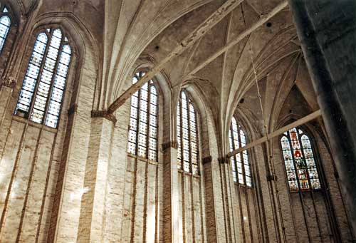 Blick in den nördlichen Chor. Rechts ist eines der beschädigten Chorfenster zu sehen. |
