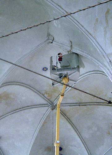 Rostocks größtes gotisches Bauwerk Notreparatur im Chorumgang Das hatte es in St. Marien bislang auch noch nicht gegeben. Ein Hubsteiger der Firma Starlift rumpelte auf Gummiketten, die die Fußbodenplatten unbeschadet ließen, durch das Südportal in die Kirche und bezog im Chorumgang Position. Der Grund für dieses recht ungewöhnliche Manöver war wieder einmal ein akuter. In Vorbereitung der weiteren 2006 anstehenden Arbeiten gab es eine gründliche Begehung der Kirche, in deren Mittelpunkt die Begutachtung der Gewölbe stand. Dabei entdeckten die Baufachleute erstmals bedenkliche Risse in den Gewölben des Kapellenkranzes im Chorumgang, direkt vor der Astronomischen Uhr. Der Handlungsbedarf war dringend. Um eine längere Sperrung zu vermeiden, kam nur eine Sofortmaßnahme in Frage. Das erstmals in der Marienkirche zu beobachtende Ereignis der Arbeit von einem Hubsteiger aus ist noch bis zum Montag, den 12. Juni zu besehen. Dann sollen die bis dahin vorgenommenen ersten Sicherungsarbeiten abgeschlossen sein und der Hubsteiger wird die Kirche wieder verlassen. Der Weg zur Astronomischen Uhr ist dann wieder frei. Die Arbeit an den Gewölben ist damit jedoch nicht abgeschlossen. Sie muß von oben weitergeführt werden. Die vorgenommenen Reparaturarbeiten zeigten, dass Steine locker saßen und herunter stürzen konnten. Ein abgenommener loser Rippenstein zeigt die Problematik. Auch bei den weiteren Arbeiten im Sicherungsabschnitt 2006 bis 2008 wird das Hauptaugenmerk auf die Hochschiffgewölbe in 32 Metern Höhe gerichtet sein. |