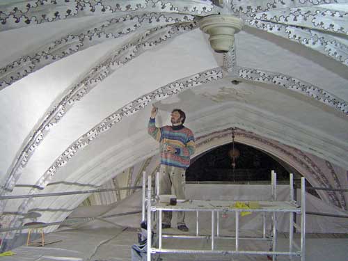 Restaurator Marcus Mannewitz bei der Arbeit an den Kreuzrippen der Chorgewölbe. |