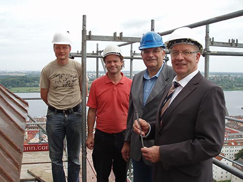 Frank Thoms, Tilmann Jeremias, Frank Sakowski und Roland Methling auf dem Gerüst der Marienkirche. |