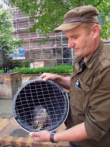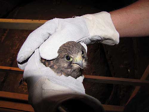 Der Jungfalke wird in den Nistkasten gesetzt.