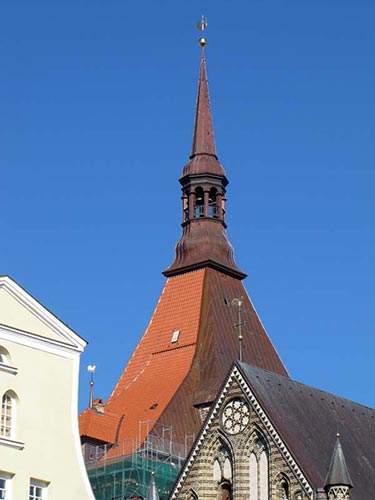 Äußere Arbeiten sind beendet Es ist nicht zu verkennen. Das Gerüst am Dach des Marienkirchturms ist bis zum Turmansatz zurück gebaut. Die äußeren Arbeiten in diesem Bereich konnten abgeschlossen werden. Weithin sichtbar sind die neuen Ziegel des Daches. Sie strahlen in kräftigem Rot über der Stadt. Auch das neue Kupferdach an der Ostseite ist nicht zu übersehen. Es ist dies gewiss ein deutliches Zeichen für den Fortgang der Arbeiten bei der Reparatur und Restaurierung des Westturms. Noch aber sind Arbeiten im Inneren des Dachstuhls auszuführen. Unter anderem müssen die Dachziegel von innen mit Draht festgebunden werden. Dazu werden alle Fugen der Dachziegel von innen verstrichen. Gleichzeitig beginnen im Turm die Vorbereitungsarbeiten zur Wiederaufnahme der im August 2009 zur Restaurierung gebrachten alten Glocken. Und auch die Arbeiten direkt am Turm werden weitergeführt. |