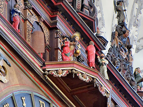 Zu den Reparatur- und Restaurierungsarbeiten an der Astronomischen Uhr der Marienkirche gehörten auch die Arbeiten am Apostelumgang. Vier Wochen lang konnte er nicht angesehen werden. Die sechs Holzfiguren wurden abgebaut und restauriert. Sie wurden entstaubt, vom Fett befreit und gesäubert. Nun stehen sie wieder auf ihrem Umlauf. Nach dem Ausbau und der Einlagerung der Figuren wurde das Uhrwerk in seine einzelnen Teile zerlegt. Hebel wurden erneuert und Räder ausgewechselt. Darüber hinaus wurde der Eisenkranz, auf dem die Apostel stehen, durch einen leichteren ersetzt. Der alte Kranz war zu schwer. Außerdem wurde das Stahlseil, das für die Spannung auf der Kurbel sorgt, abgenommen. Nun übernimmt wieder ein Hanfseil die Aufgabe. Das Stahlseil hatte bereits Spuren im Holz hinterlassen. Der Restaurator Markus Mannewitz und der Schwaaner Uhrmachermeister Helmut Langner hatten die Arbeiten übernommen. |