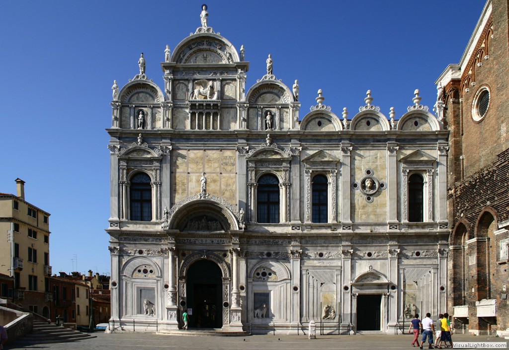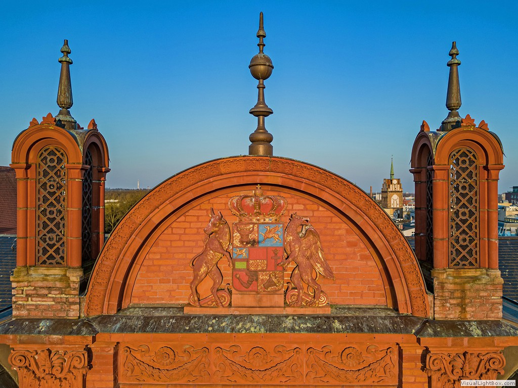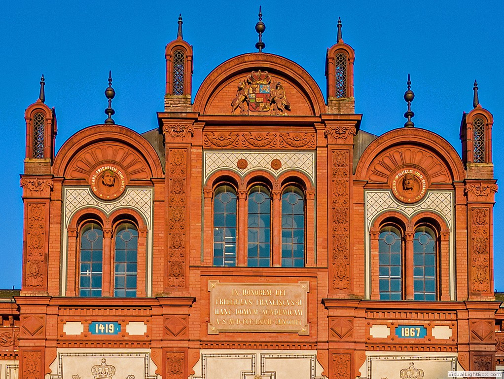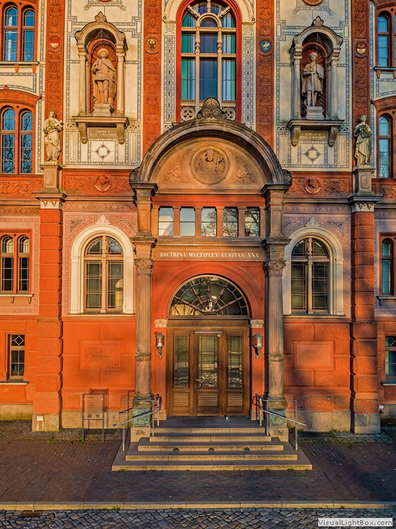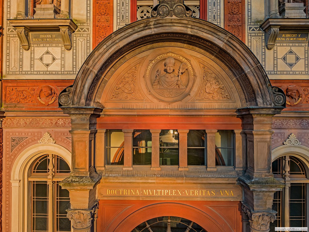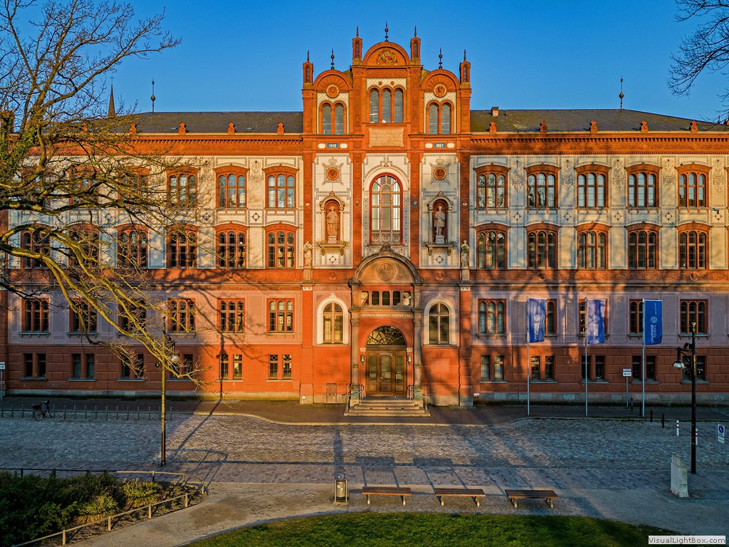 Die Mecklenburg-Schwerinsche Landesuniversität in Rostock Ob sich der Schweriner Architekt Hermann Willebrand damals selber auf den Weg nach Italien machte, um dort nach Bauten der Renaissance Ausschau zu halten, ließ sich nicht ermitteln. Der Auftrag wurde von Großherzog Friedrich Franz II. an besagten Hermann Willebrand gegeben. Willebrand war 1839 zum Baukondukteur ernannt worden. 1851 wurde er Hofbaumeister und 1857 Hofbaurat. Mit seinem umfangreichen Wirken war er ein damals schon sehr bekannter Baumeister. In Sachen der Errichtung eines neuen Universitätsgebäudes hatten sich 1864 der Rektor und das Konzil der Universität an den Landesherrn mit dem Ersuchen gewandt, ein neues Bauwerk in Auftrag zu geben. Das Weiße Kollegium, das auf dem Grundstück stand, war baufällig geworden. Auch reichte der Platz für die Aufgaben der Institution nicht mehr aus. Ein Jahr später wurde ein Baugutachten erstellt. 1866 wurde das Weiße Kollegium abgerissen. Willebrand lieferte auftragsgemäß den neuen Bauentwurf. Im März 1867 folgte die Grundsteinlegung für den Neubau, pünktlich zum silbernen Thronjubiläum des Großherzogs. Die Bauarbeiten gingen zügig voran, so dass das Richtfest bereits am 8. November 1867 gefeiert werden konnte. Am 27. Januar 1870 war es dann soweit. Das neue Hauptgebäude konnte feierlich eröffnet werden. Es war nicht nur für den Landesherrn ein Gewinn. Auch für Rostock war der prachtvolle Bau eine architektonische Bereicherung. Der Großherzog hatte sich einen Bau in Neorenaissance gewünscht. Anregungen ließen sich für Willebrand vom Wismarer Fürstenhof und von den Renaissanceflügeln des Schweriner Schlosses einholen. Doch dann war da noch die italienische Renaissance, die den Architekten gedanklich nach Venedig führte. Gab es dort doch die Scuola Grande di San Marco. Der Name irritiert zunächst, handelt es sich doch keineswegs um eine Schule. Vielmehr ist es das prachtvolle Haus der Bruderschaft der Goldschmiede und Seidenhändler aus der Zeit der venezianischen Frührenaissance. Die beiden Gewerke hatten es durch ihr tatkräftiges Schaffen zu einigem Reichtum gebracht und konnten sich entsprechend einrichten. Die Laienbruderschaft war eine von sechs großen Bruderschaften in Venedig und befasste sich mit karitativen und geistlichen Aufgaben. Sie wurde bereits im Jahre 1260 gegründet und zog in der Zeit um 1437 in ihr neues Haus. Am 30. März 1485 wurde das ursprüngliche Gebäude durch ein Feuer zerstört. Die Scuola wurde bis ins frühe 19. Jahrhundert von der Bruderschaft geführt, bis alle Bruderschaften durch Napoleon aufgelöst wurden. 1808 zog ein österreichisches Militärkrankenhaus ein. 1819 wurde daraus ein ziviles Krankenhaus. Das Erdgeschoss ist heute der Haupteingang in die Klinik. Im Obergeschoss gibt es eine medizinische Bibliothek, eine historische Apotheke, eine Sammlung alter chirurgischer Instrumente, das Museum für pathologische Anatomie und das historische Archiv der alten venezianischen Krankenhäuser. Die optische Verwandtschaft dieser Fassade mit der der Rostocker Universität ist schon auf den ersten Blick unverkennbar. Zweifellos hat Willebrand damit eine gute Wahl getroffen.