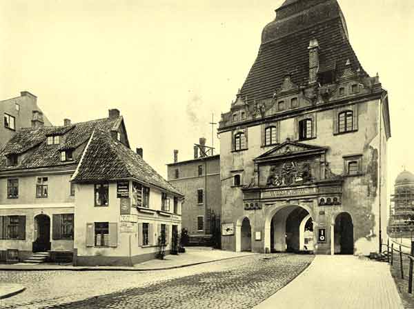 Zu sehen ist das mit barockem Zierrat zur Stadtseite hin überladene Steintor um 1900, als noch die Pferdebahn hindurchfuhr. Links im Bild die "Krim". Sie war bekannte Künstlergaststätte und wurde gern von Schauspielern und Musikern des Stadttheaters besucht |