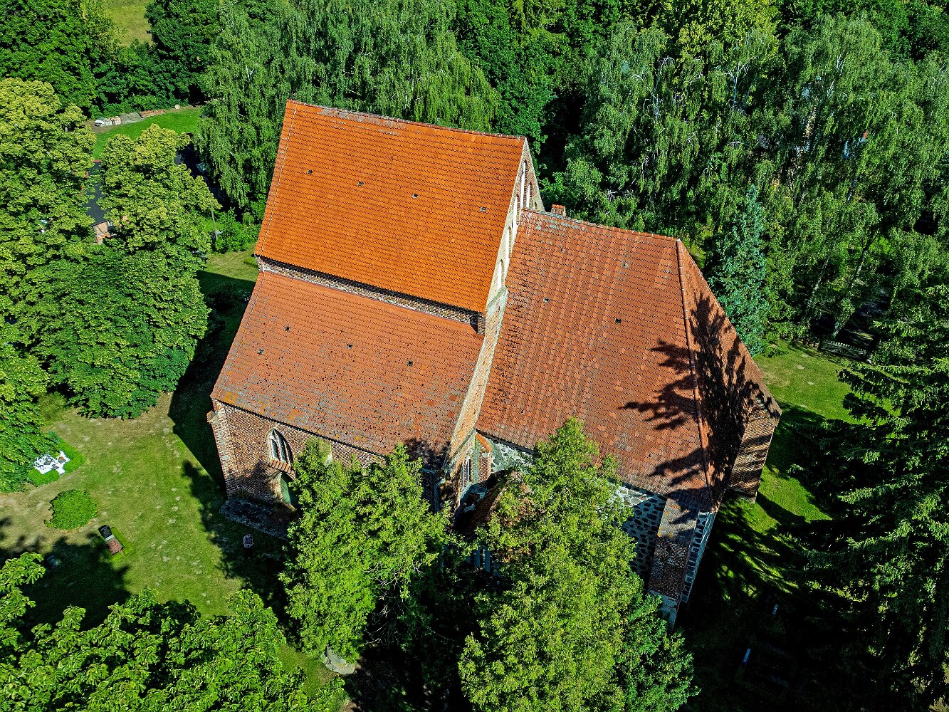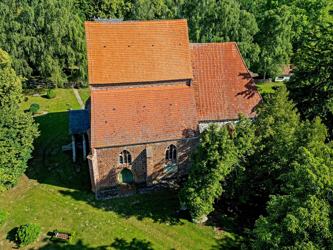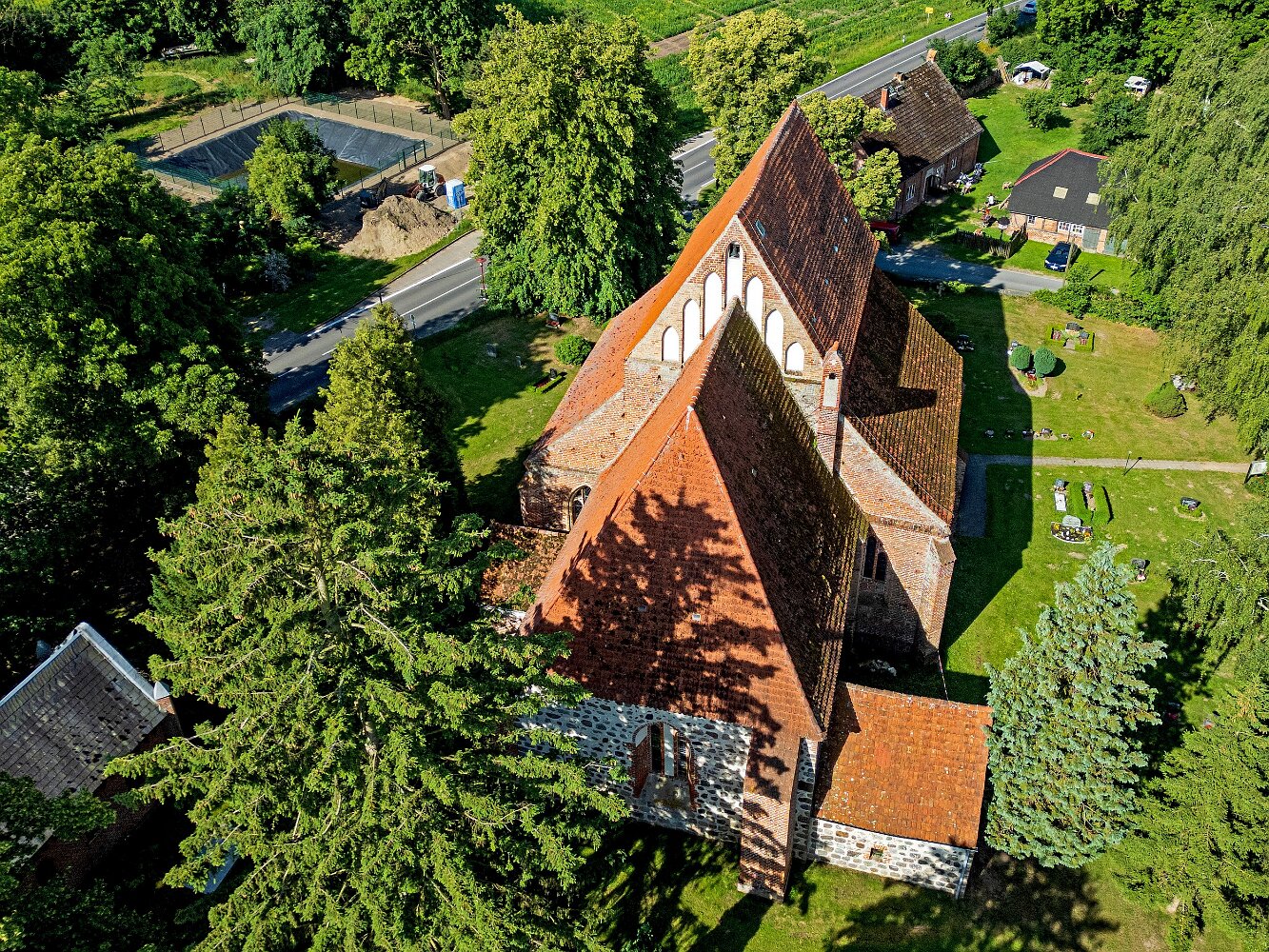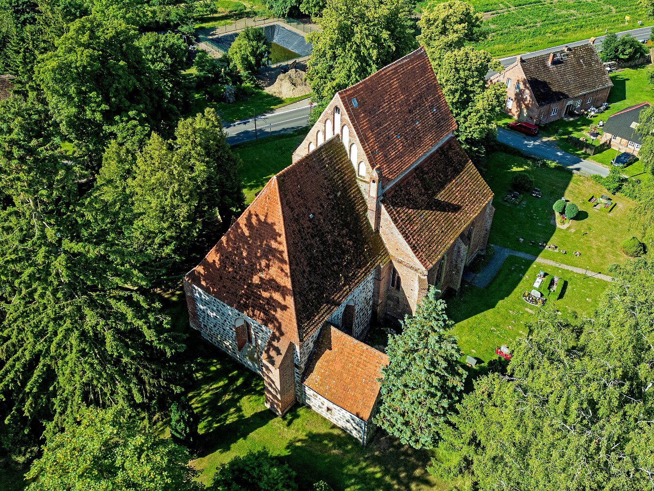 Die Feldsteinkirche in Basse auf Drohnenfotos