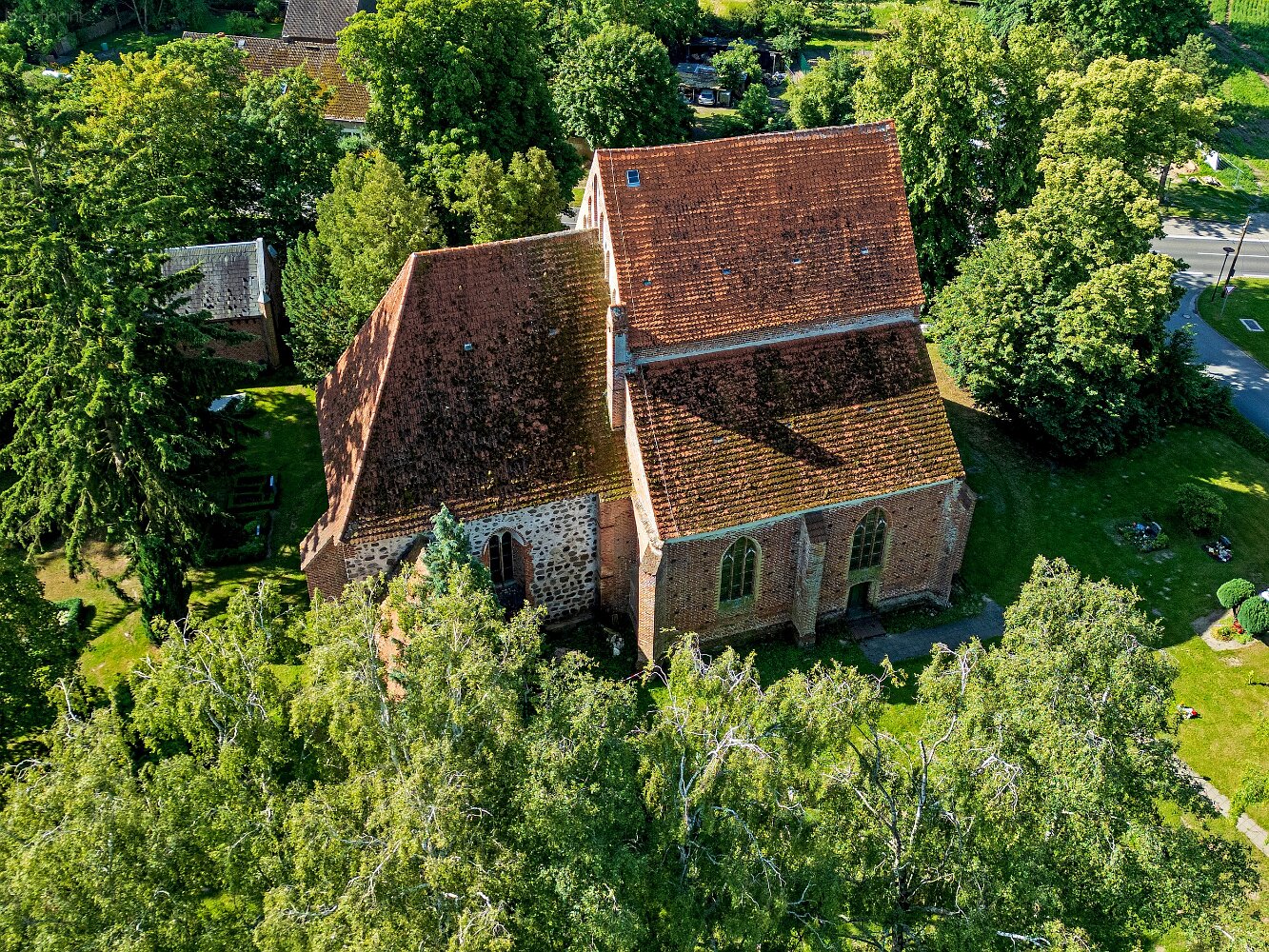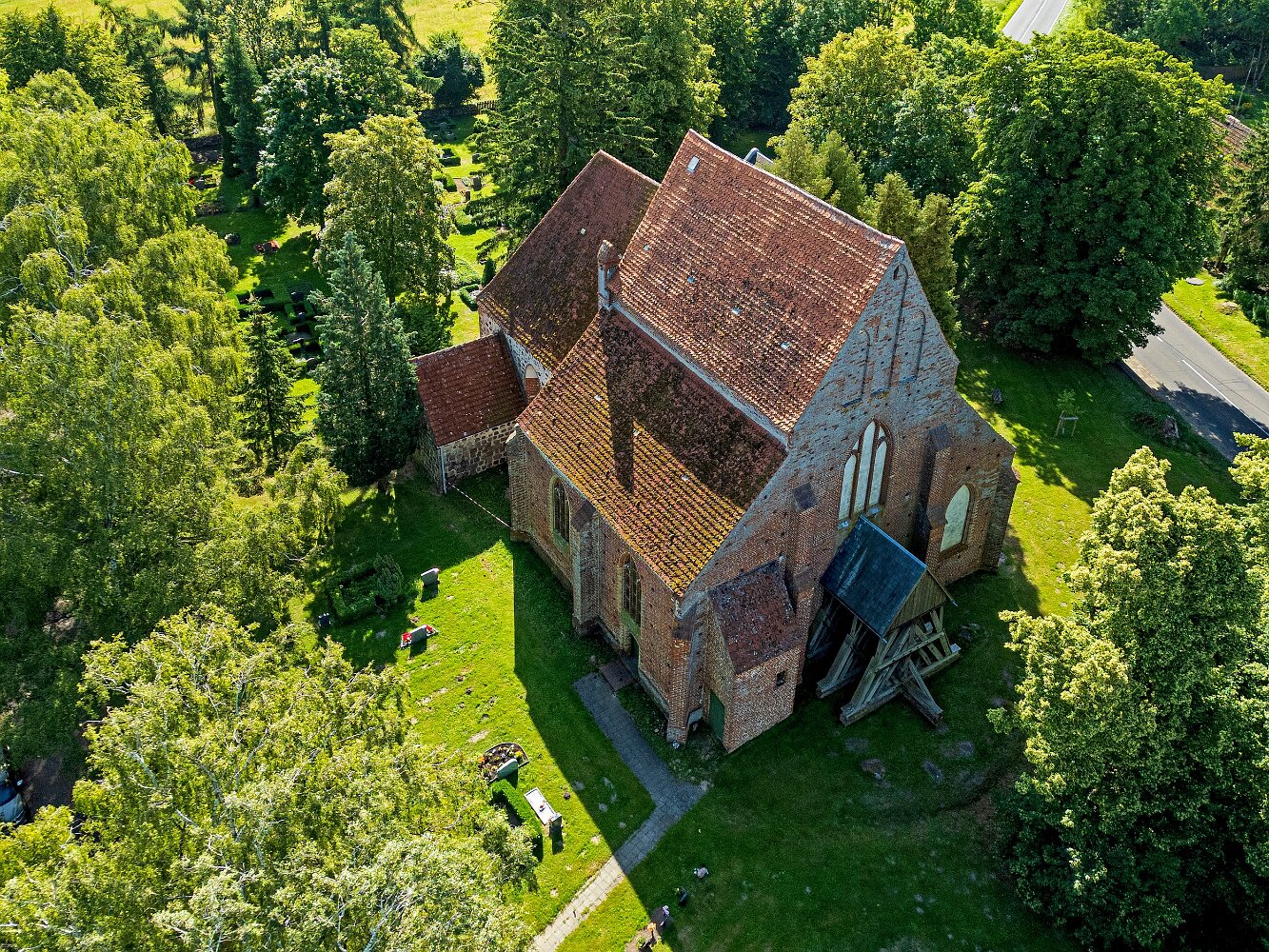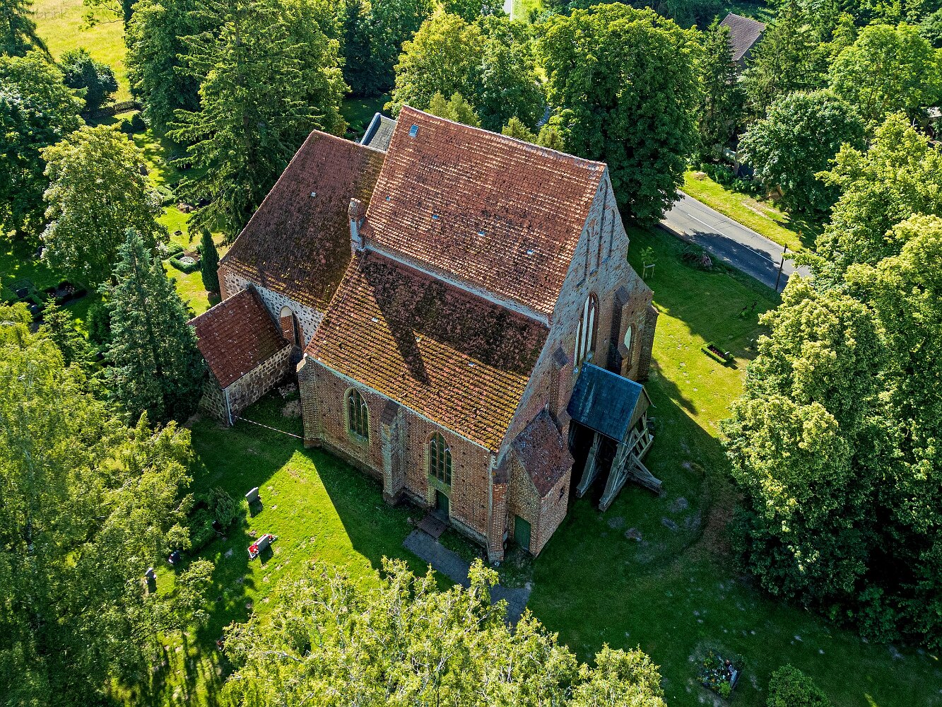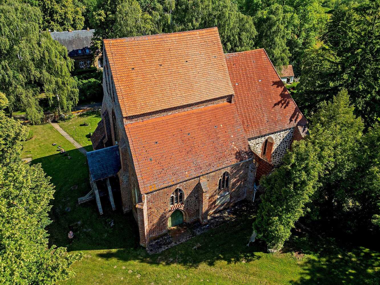 Die Feldsteinkirche in Basse auf Drohnenfotos