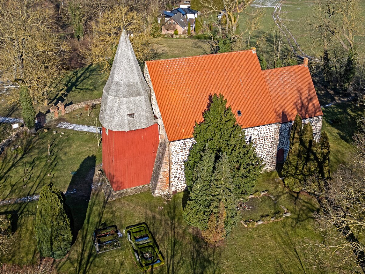 Drohenaufnahmen der Feldsteinkirche in Tribohm