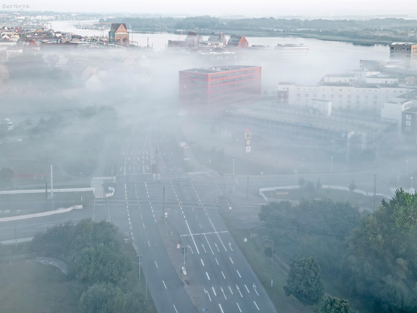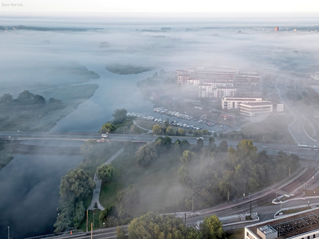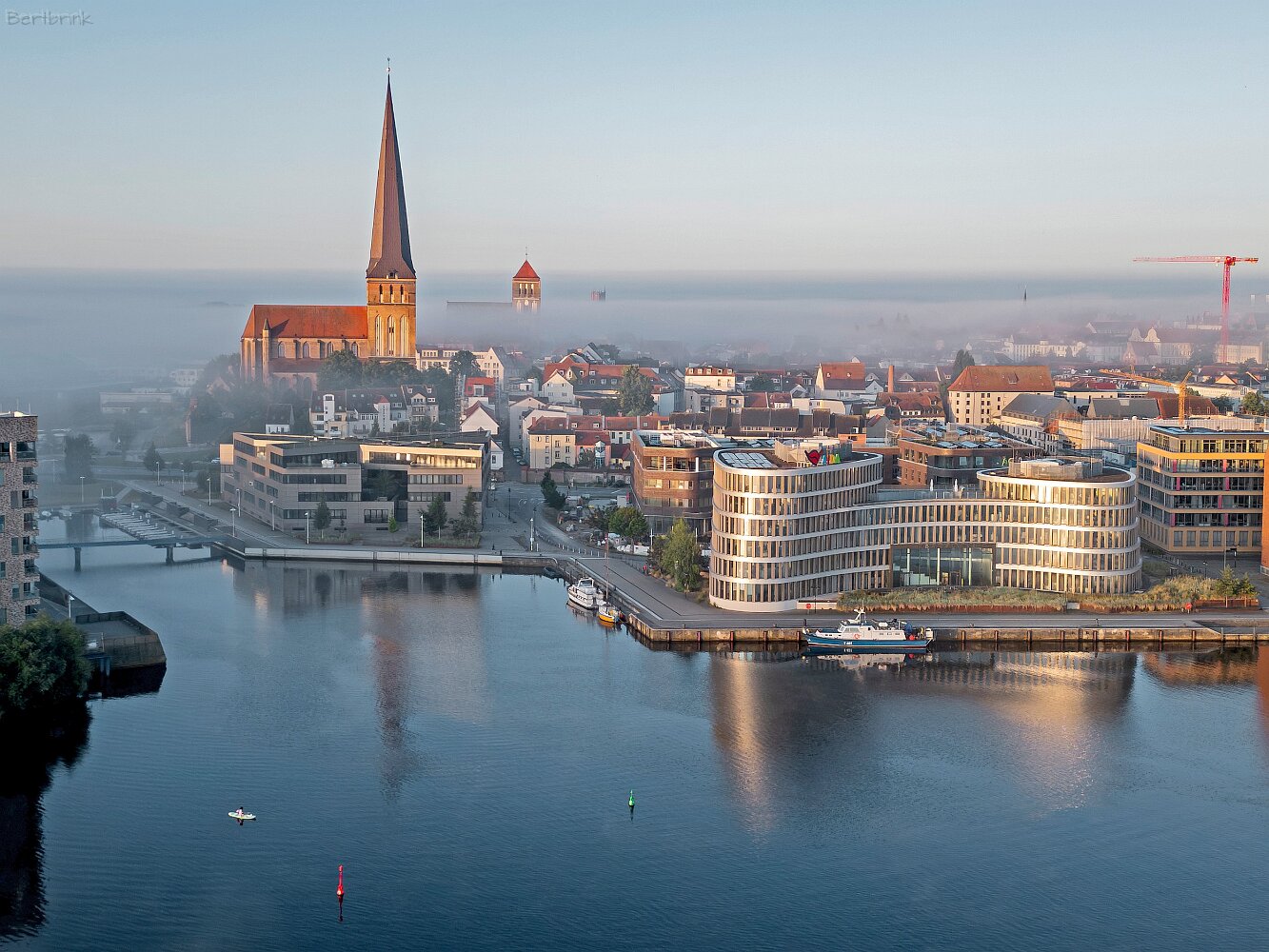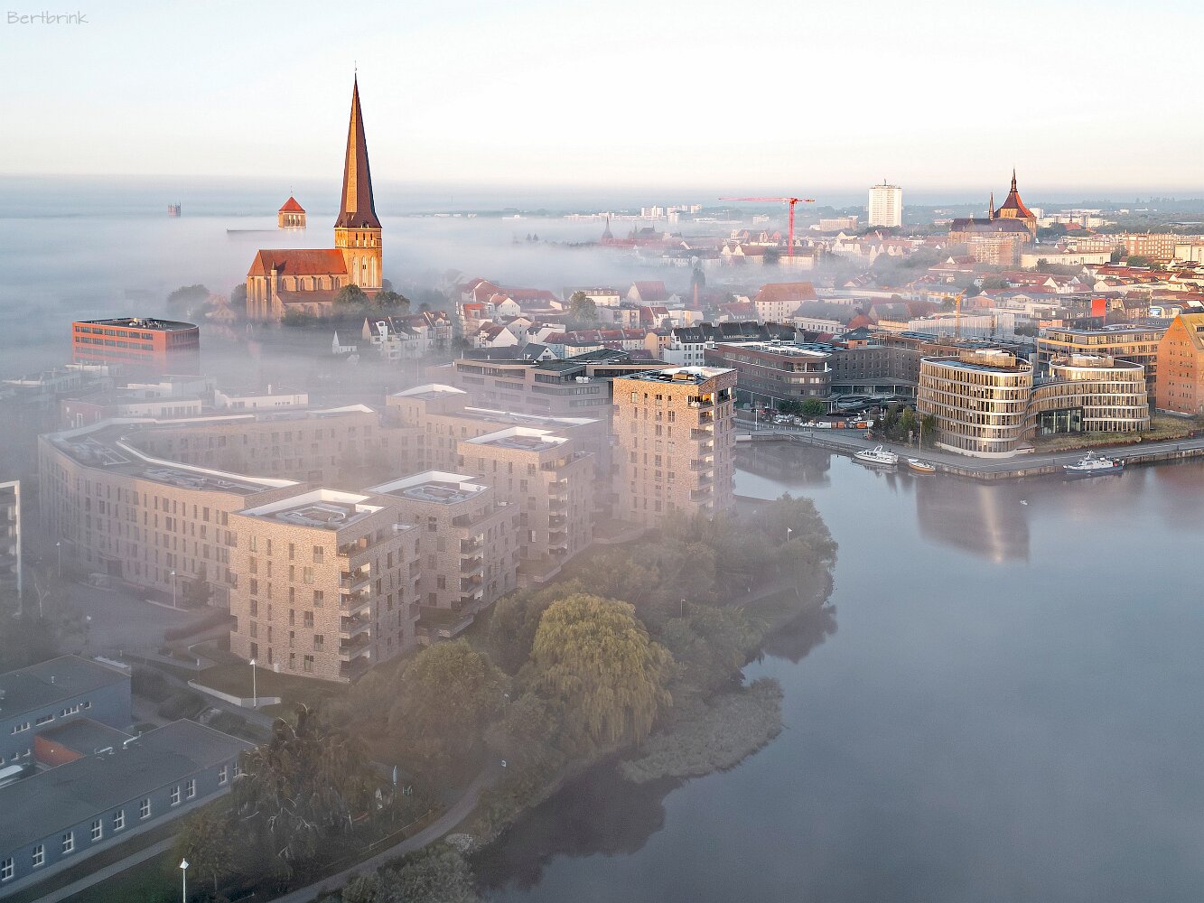 Sonnenaufgang im Nebel über der Warnow in Rostock