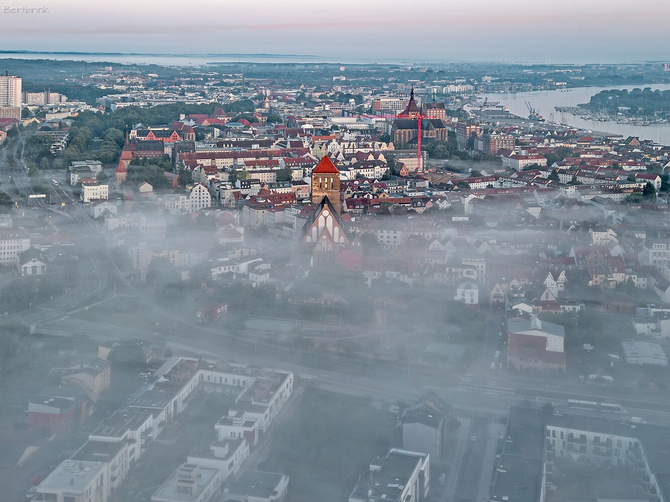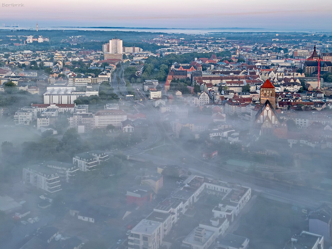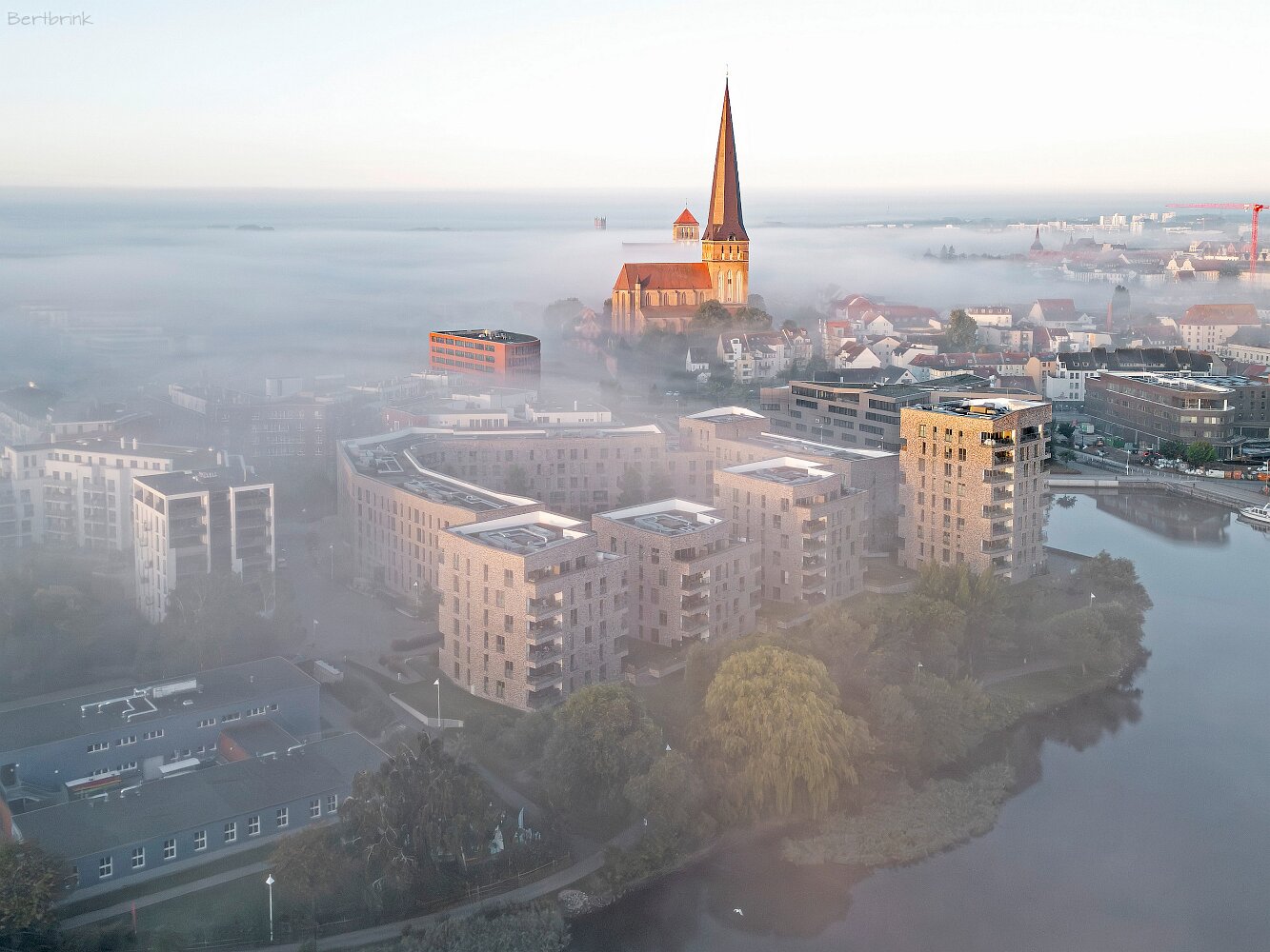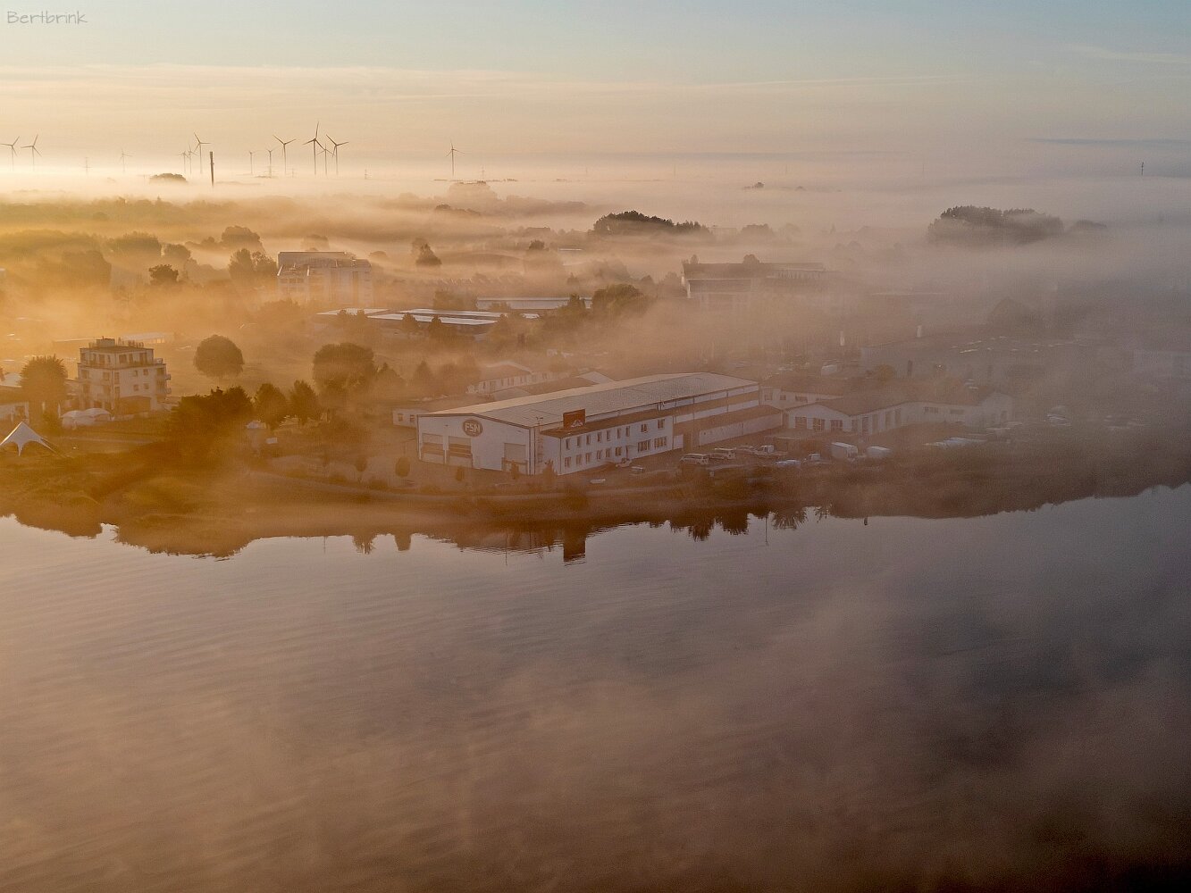 Sonnenaufgang im Nebel über der Warnow in Rostock
