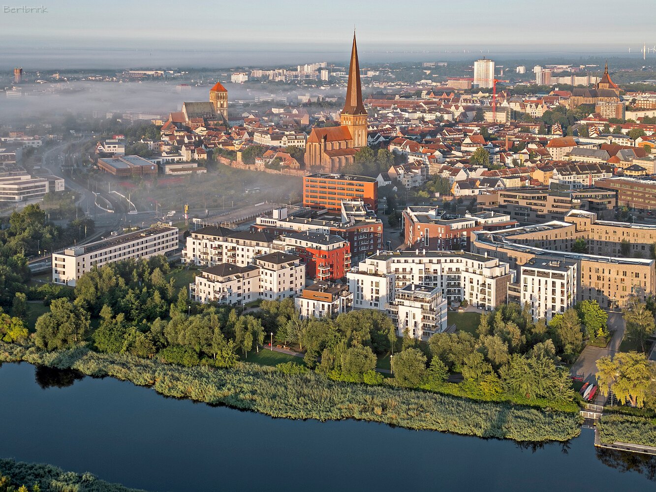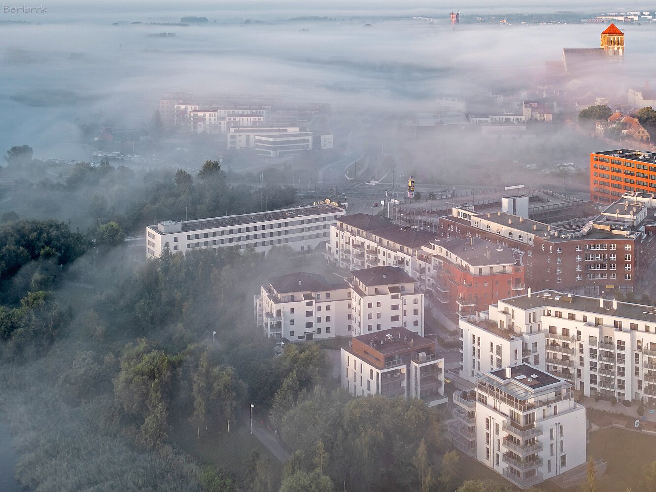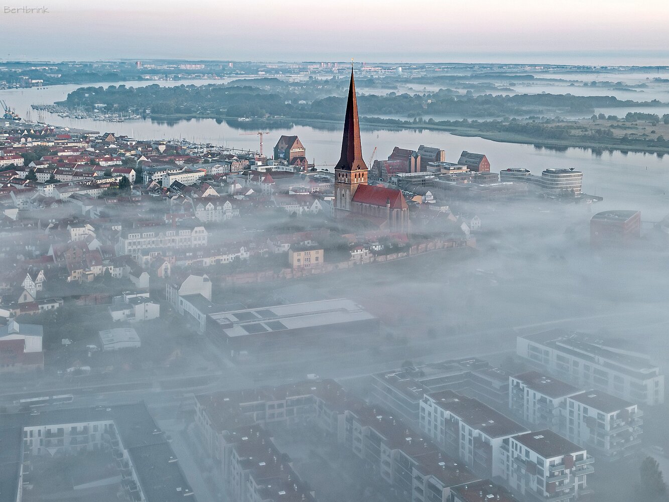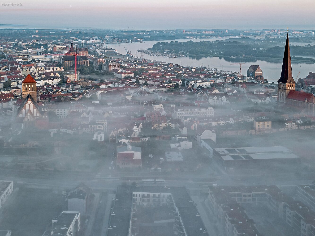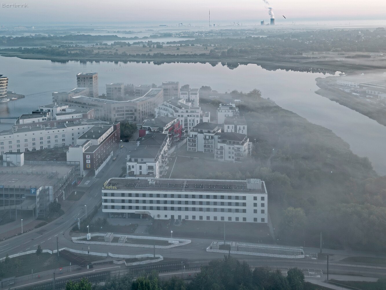 Sonnenaufgang im Nebel über der Warnow in Rostock
