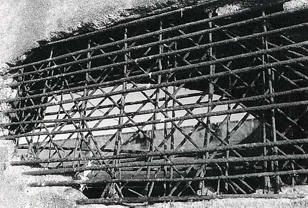 Die aufgebrochene Backbordseite zeigt die Struktur der Armierung innerhalb des Rumpfes.