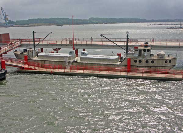 Das restaurierte Betonschiff "Capella" am Warnowufer in Rostock-Schmarl.